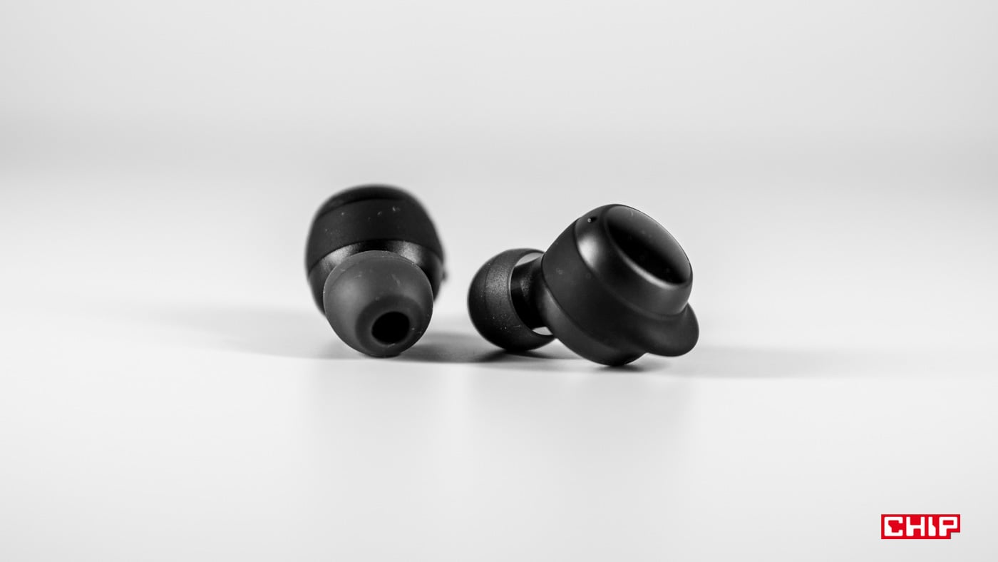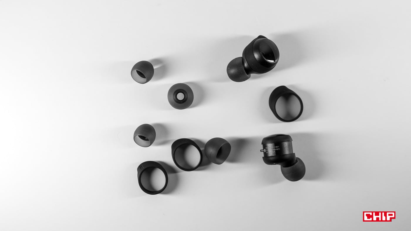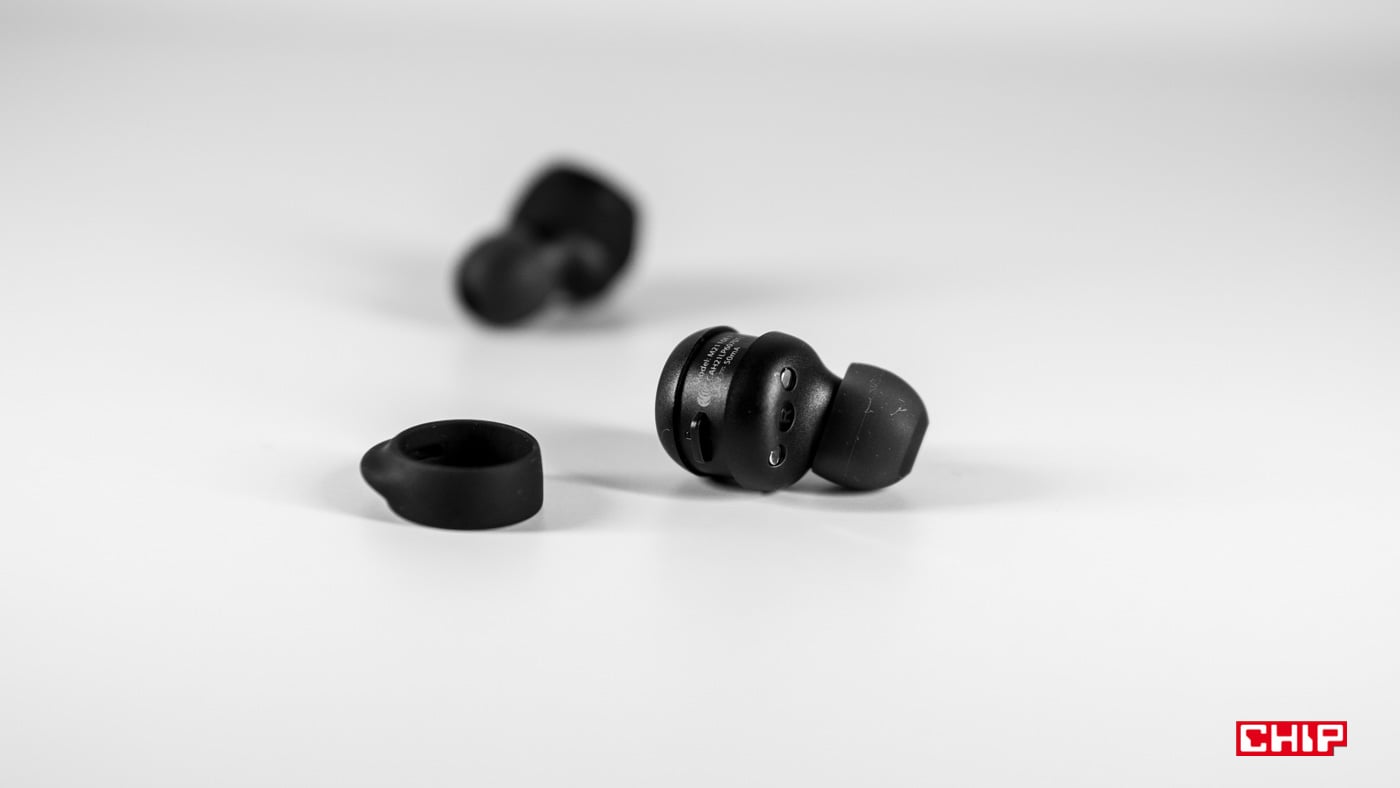 Szkoda tylko, że jednocześnie trudno doszukać się na kartonie informacji o braku przewodu USB-C. W zestawie znajdziemy bowiem oprócz słuchawek, etui, instrukcji obsługi i karty gwarancyjnej, tradycyjne trzy zestawy gumek (S, M, L) i dwie nakładki typu ear-hooks (S/L).