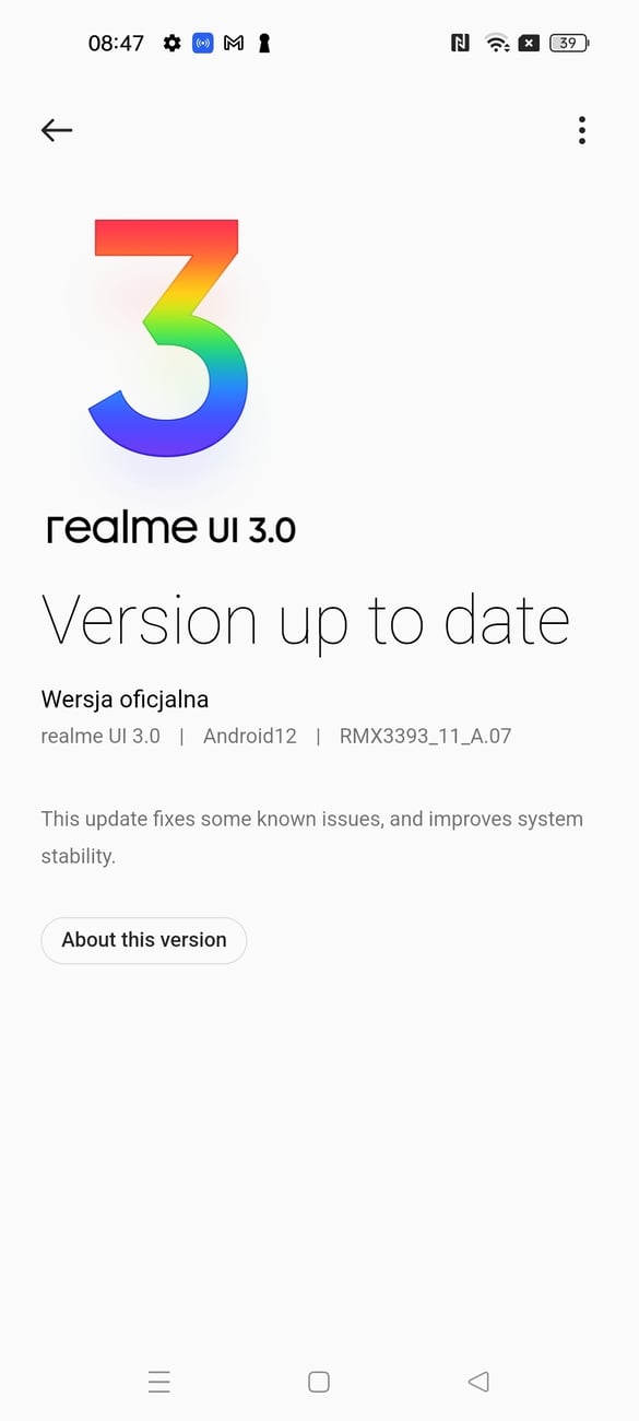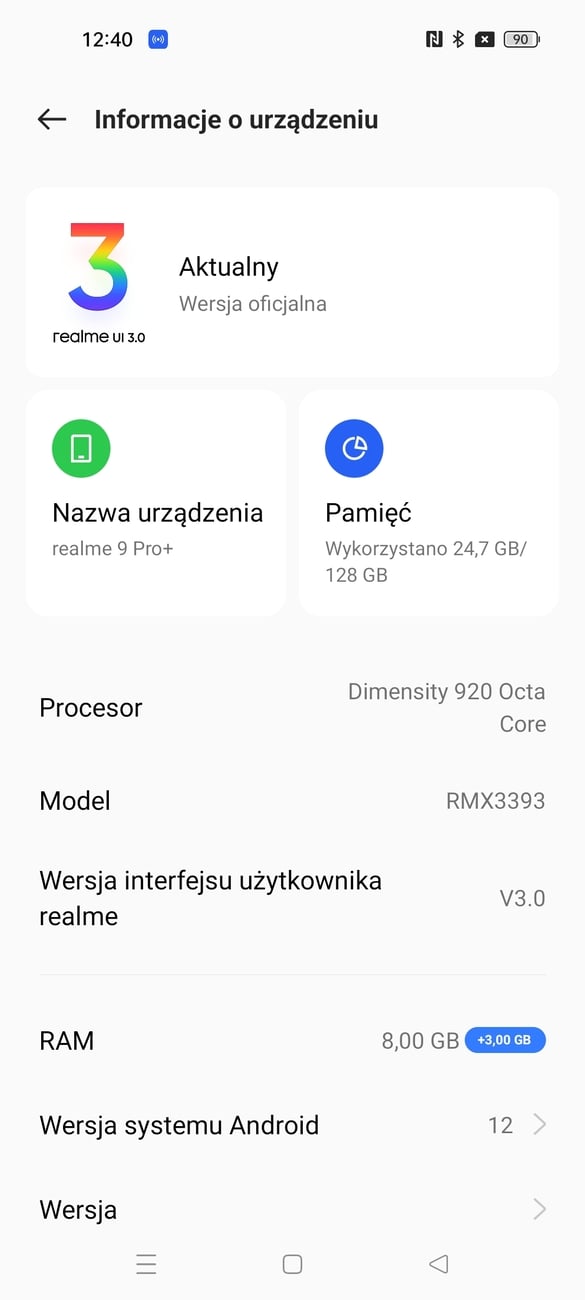 Smartfon działa pod kontrolą Androida 12 i nakładką realme UI 3.0. Miałem wczesną wersję testową, gdzie przychodziły aktualizacje po nawet 4,21 GB, ale i tak system działał płynnie i stabilnie przez cały okres trwania testów.
