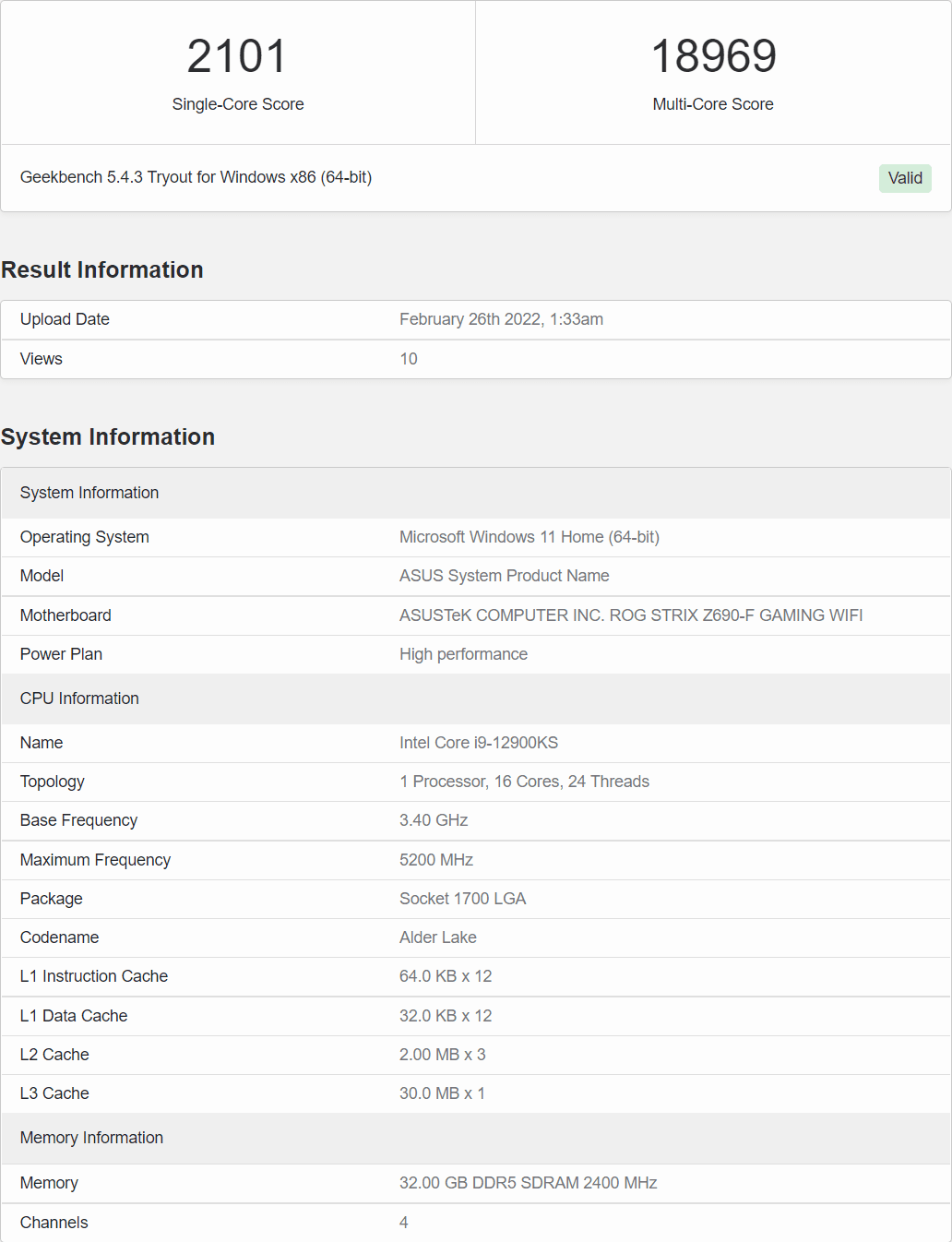 Wróćmy jednak do tego, co najświeższe, czyli testów Intel Core i9-12900KS w benchmarku Geekbench 5, które pokazują, że procesor uzyskał 2101 punktów w teście jednowątkowym i 18969 punktów w teście wielowątkowym. Co jest w tym najważniejsze? Przede wszystkim to, że to pierwszy przypadek przebicia poziomu 2000 punktów w teście jednordzeniowym dla niepodkręcanych procesorów stacjonarnych. Obecny “oficjalny król”, to Core i9-12900K, który zbliża się do tego poziomu ze swoimi 1998 punktami w teście jednowątkowym i 17151 w wielowątkowym.