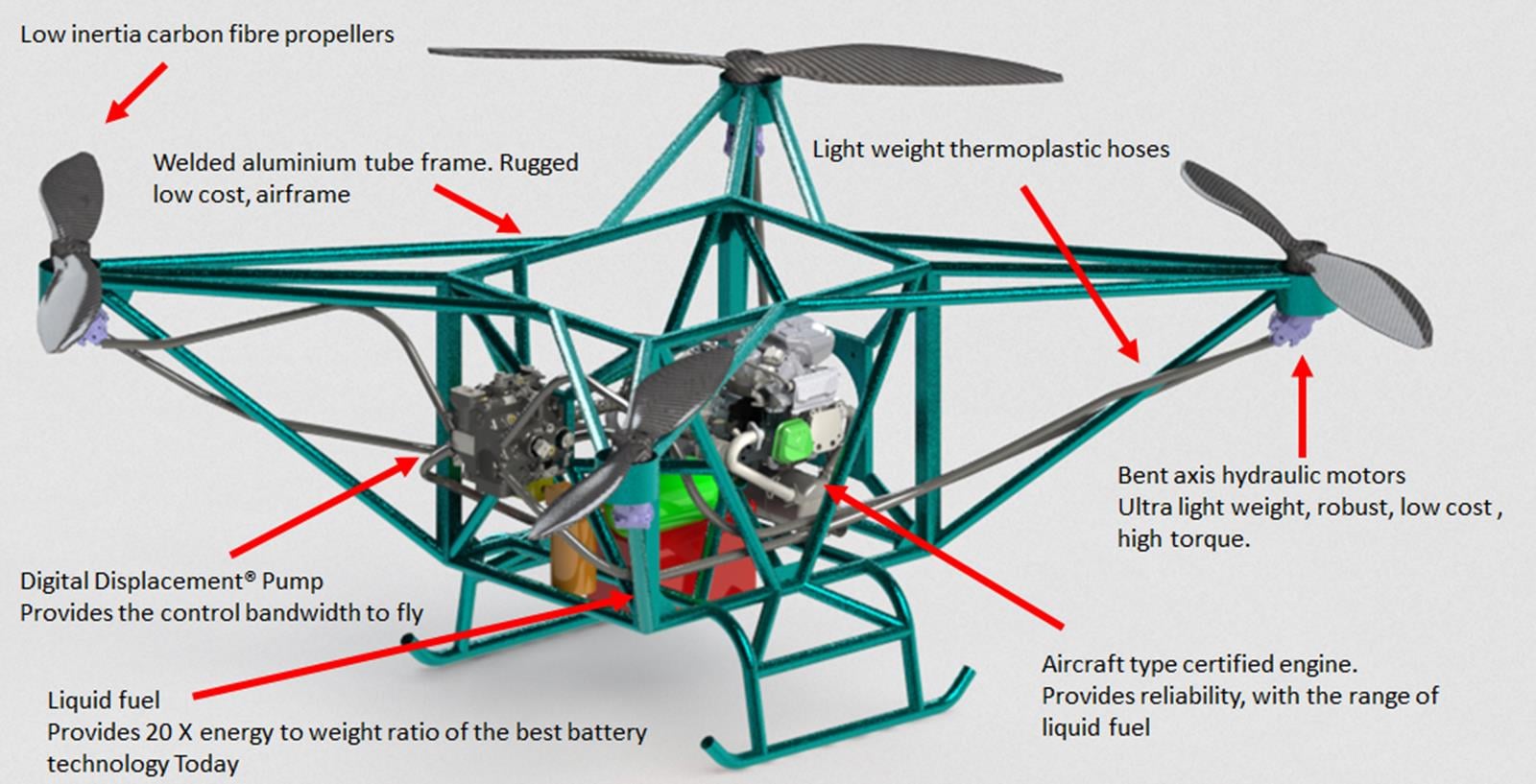 Dlatego też ten pierwszy na świecie dron hydrauliczny wykorzystuje silnik spalinowy z certyfikatem lotniczym, aby wygenerować więcej mocy w celu zwiększenia ładowności i zasięgu lotu przy jednoczesnym zachowaniu stabilności pojazdu w powietrzu. Ten silnik napędza pompy Digital Displacement, które rozprowadzają i regulują przepływ hydrauliczny w celu utrzymania drona w równowadze oraz napędzają silniki hydrauliczne o łącznej mocy 129 koni mechanicznych.