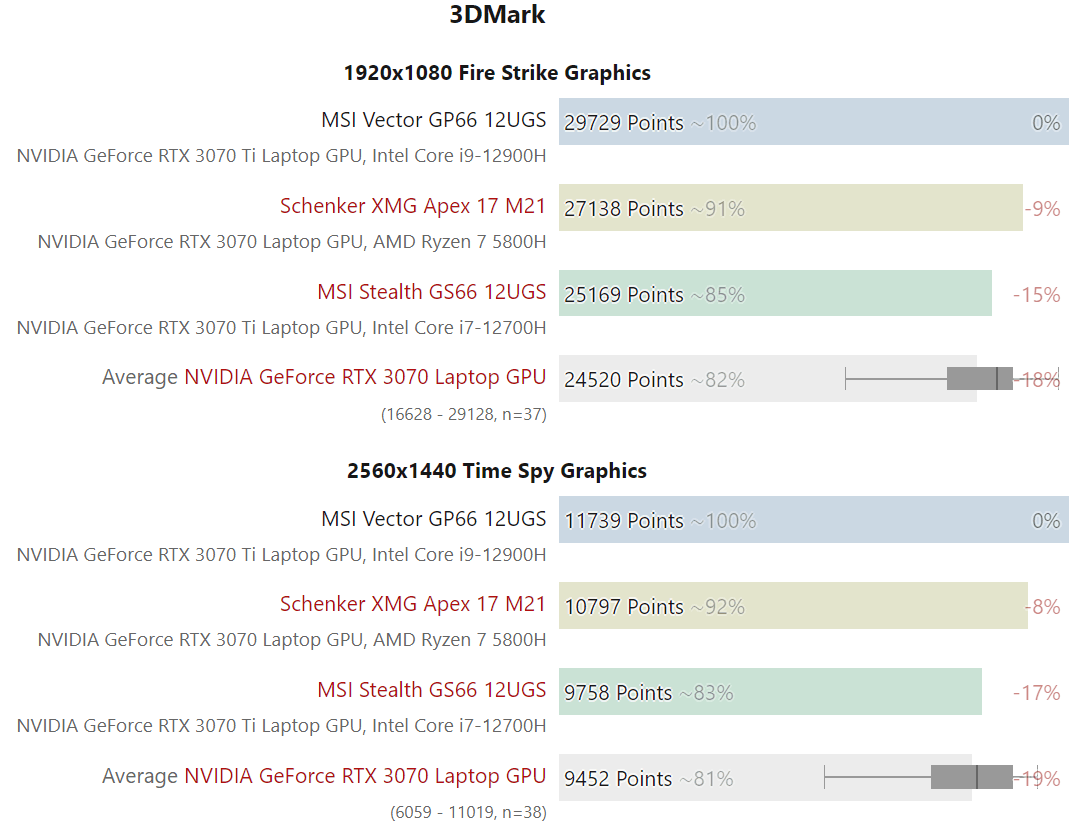 W sieci pojawiły się najnowsze testy wydajności dwóch różnych wariantów kart graficznych GeForce RTX 3070 Ti, których poziom parametru TGP wynosi kolejno 150 watów (MSI Vector GP66) i 105 watów (MSI Stealth GS66). Porównał ją następnie do laptopów wyposażonych w karty RTX 3070 o podobnych poziomach TGP, a wykresy wskazały jasno, że w niekorzystnej konfiguracji mobilny RTX 3070 może przewyższyć wydajnością RTX 3070 Ti.