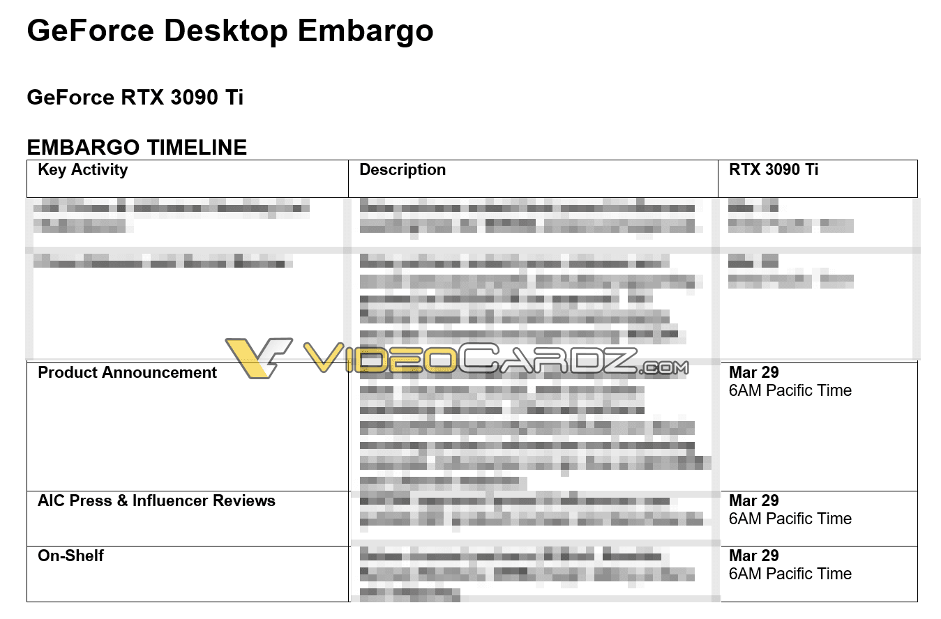 Wedle dokumentu wydanego przez Videocardz, który dotyczy bezpośrednio wewnętrznych planów NVIDIA, GeForce RTX 3090 Ti zostanie zaprezentowany światu już 29 marca. Nie będzie to jednak wyłącznie “papierowa premiera”, bo pewne jest, że doczekamy się również zarówno zielonego światła na recenzje i testy (to wskazuje na wcześniejsze wysłanie egzemplarzy testerom), a na dodatek wprowadzenia do sprzedaży.