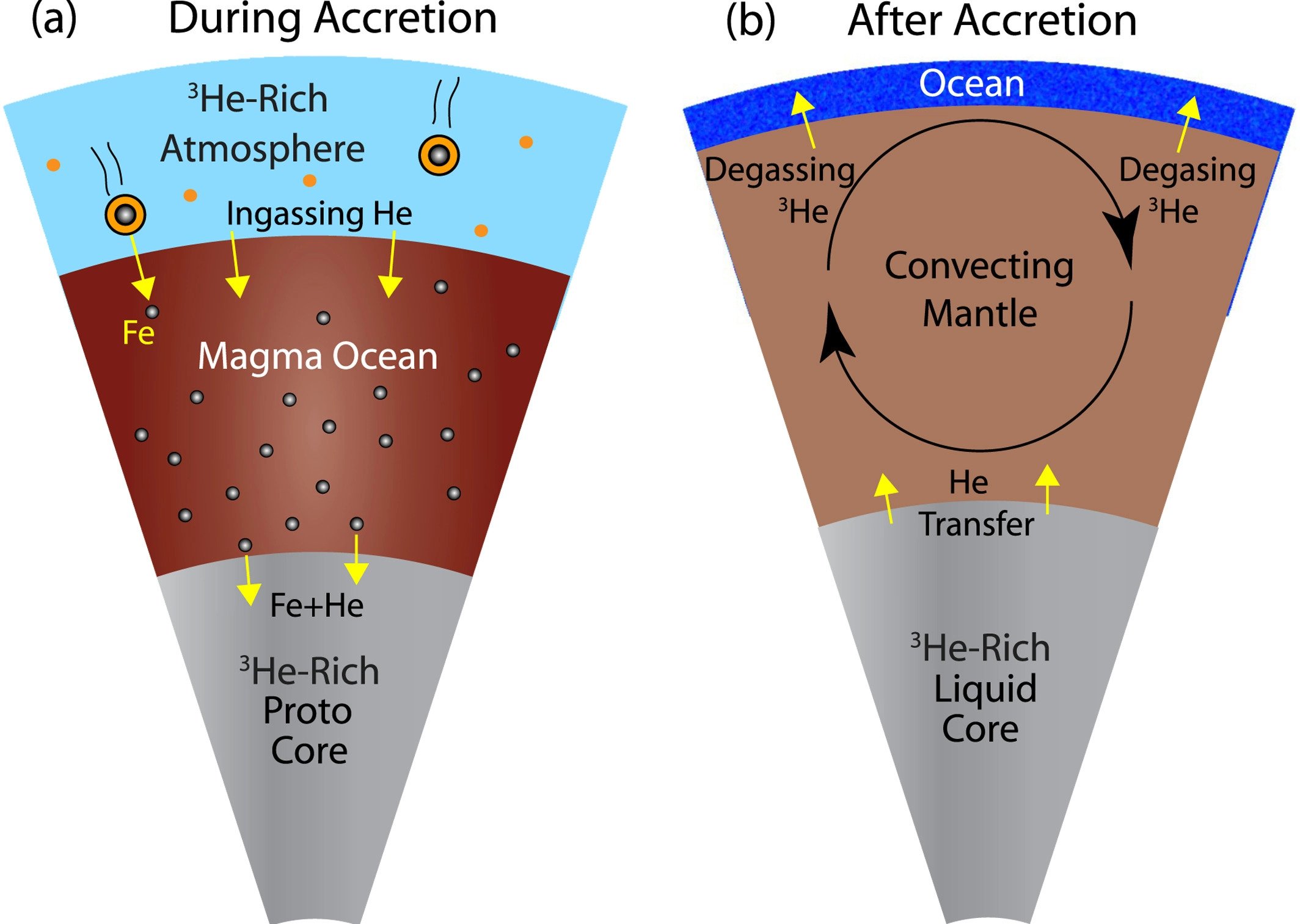 O ile hel-4 powstaje w następstwie rozpadu uranu i toru, tak hel-3 ma pierwotny charakter i utworzył się wkrótce po Wielkim Wybuchu. Innym sposobem na jego otrzymanie jest rozpad trytu. W przypadku nowych badań chodzi o ten znacznie mniej powszechny izotop, czyli hel-3, który wydostaje się z jądra Ziemi głównie za sprawą systemu śródoceanicznych grzbietów wulkanicznych. Tempo tego procesu jest stosunkowo niskie i wynosi około dwóch kilogramów rocznie.