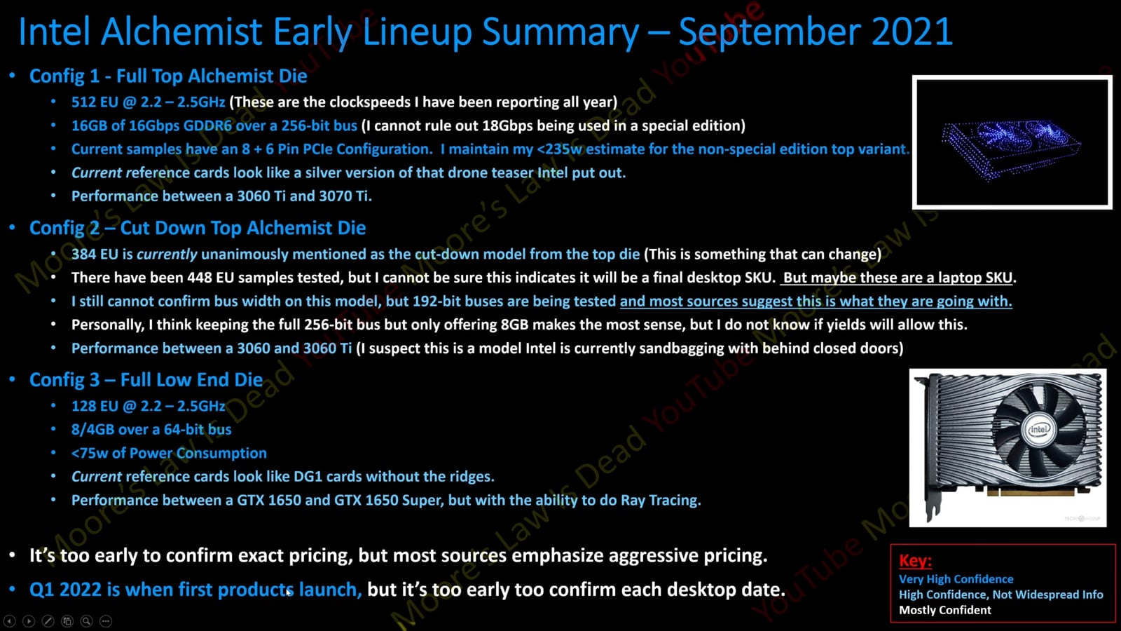 Wedle informacji z kanału Moore’s Law is Dead, który od lat udziela się w temacie przecieków na temat kart graficznych , Intel zapewni rynkowi dokładnie trzy procesory graficzne. Mowa o wersji z 512 EU (Execution Units), 384EU i 128EU z GPU, które zawalczą kolejno z kartami RTX 3060 Ti/RTX 3070 Ti, RTX 3060/RTX 3060 Ti oraz GTX 1650/GTX 1650 Super. Przynajmniej wedle przecieków. Te wspominają też, że zostaną połączone z odpowiednio 16, 8 i 8 GB pamięci graficznej GDDR6.