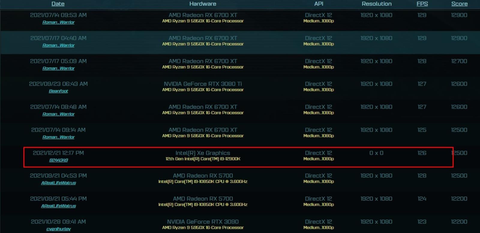 W tym sprawdzianie nieznana karta Intel Arc Alchemist uzyskała 12500 punktów ze średnią 126,9 FPS, co w bazie danych uplasowało ją na poziomie GeForce RTX 3080 Ti, ale też Radeona RX 6700 i… RX 5700 XT. Jak więc widzicie, ten benchmark nie jest specjalnie dobrą podstawą do porównywania wydajności kart, co dodatkowo komplikuje sprawę.