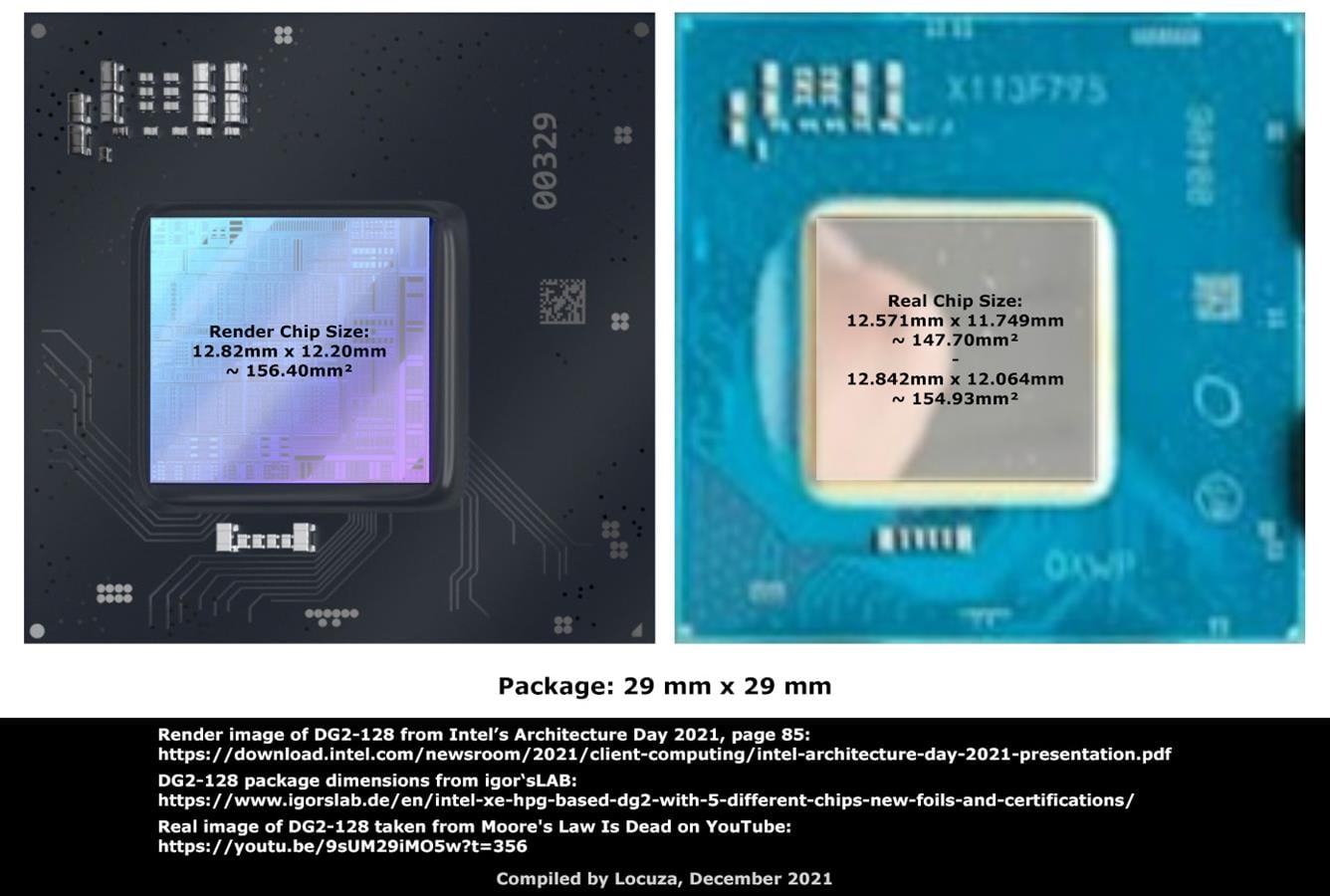 W grudniu Intel udostępnił realne zdjęcia procesorów graficznych Intel Arc Alchemist w postaci DG2-512 oraz DG2-128. Będą to ponoć jedyne GPU, na których Intel oprze swoją ofertę i które wedle obliczeń poczynionych przez Locuza z Twittera, będą mierzyć około (odpowiednio) 396,2 mm2 i 147,7-154,9mm2.