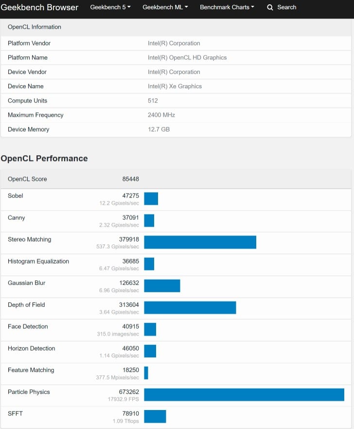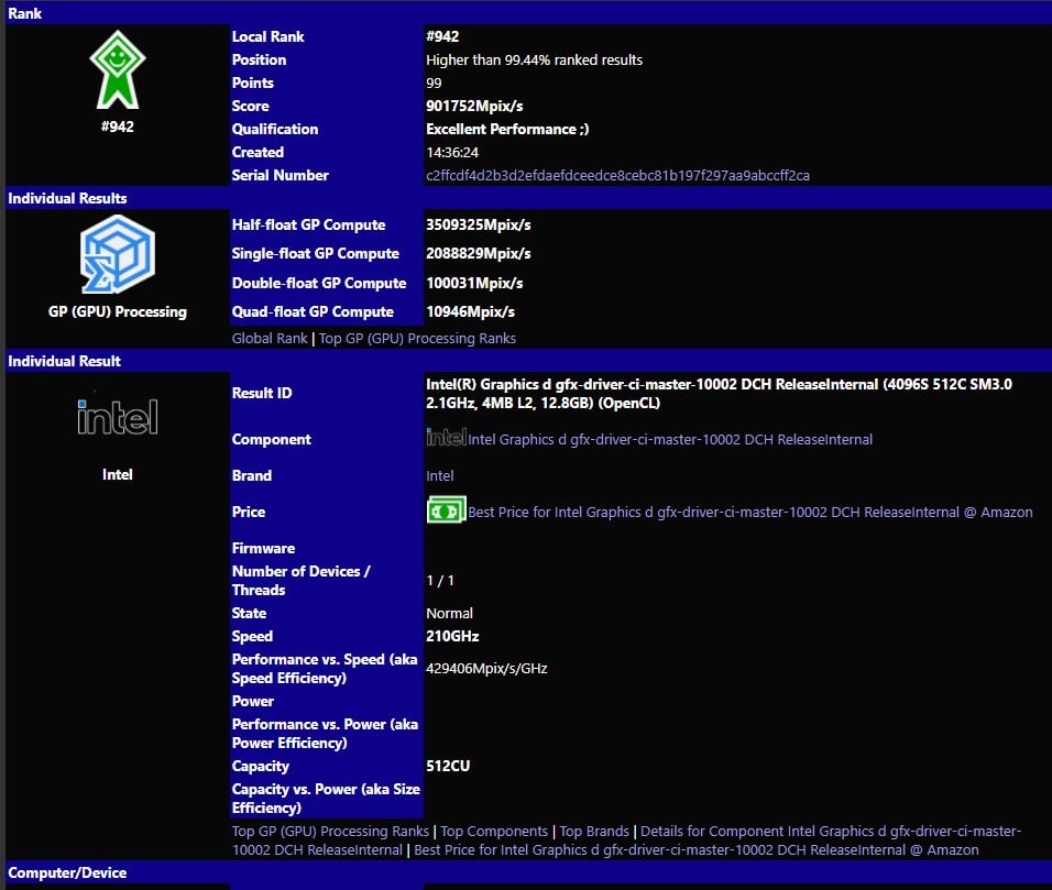 W teście domniemana karta Arc A380 była taktowana zegarem 2,45 GHz, a jej pokład pamięci objął 6 GB o przepustowości 25,68 GB/s. Wynik jej wydajności osiągnął poziom 2870 Mpix/s w obciążeniu typu ogólnego przeznaczenia, co stawia ją w tej samej lidze, do której zaliczają się mobilne GeForce RTX 3050 Ti od NVIDIA.
