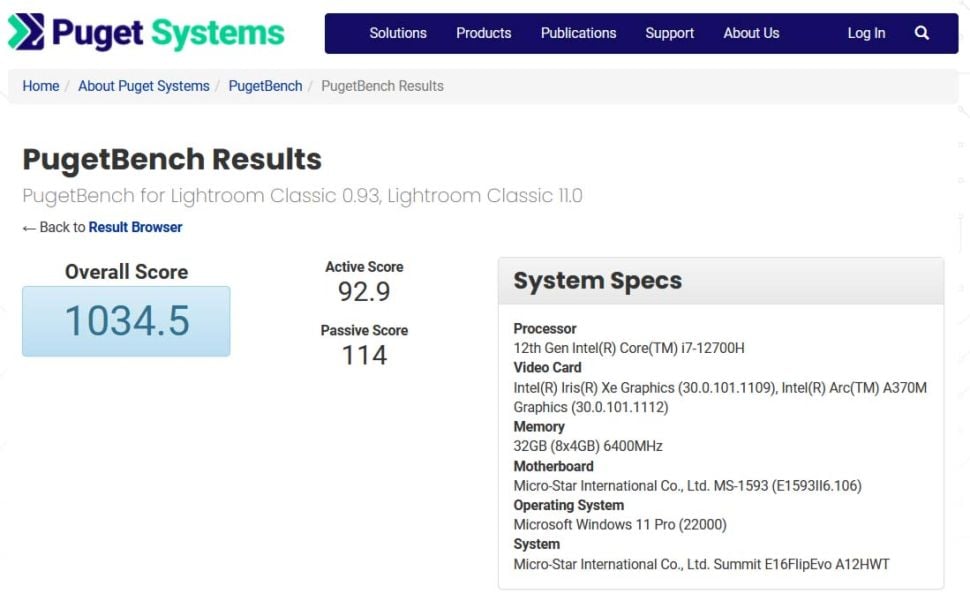 Najważniejsze jest jednak to, że test zaowocował wyciekiem poziomu wydajności procesora graficznego Intel Arc A370M w połączeniu z procesorem Intel Core i7-12700H, a więc “wyższą średnią półką” dla CPU Alder Lake. Laptop miał też dostęp do czterech modułów DDR5 o pojemności 8 GB każdy (32 GB DDR5-6400) i wspominam o tym nie bez powodu, bo uzyskane 1034,5 punktów, to świetny wynik, sugerujący zarówno wydajność RTX 3090, jak i… GTX 1660. Jest to jednak spowodowane samym rodzajem testu (Lightroom Classic 0,93, Lightroom Classic 11.0), bo wynik w nim jest zależny od procesora, magazynu danych oraz rodzaju wyjść I/O.