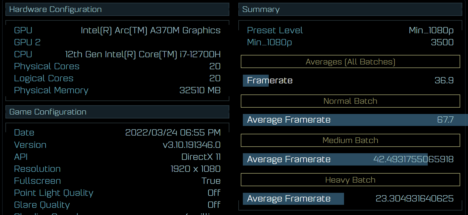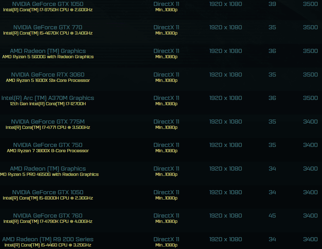 Co pokazuje wpis? Tak jak zwykle – niewiele, potwierdzając tylko to, że karty są na dobrej drodze do debiutu. Dwa testy w jakości minimalnej i w rozdzielczości 1080p z wykorzystaniem DirectX 11 wskazały, że laptop ze wspomnianą kartą graficzną (ta łączy DG2-128Eu z 4 GB GDDR6 na 64-bitowej magistrali) średnio zapewnia płynność na poziomie około 37-38 FPS. W bazie danych odpowiada to wydajności RTX 3060, ale też GTX 1050 i nawet Ryznena 5 5600, co jasno wskazuje, jak niedokładne wyniki są prezentowane w tym benchmarku.
