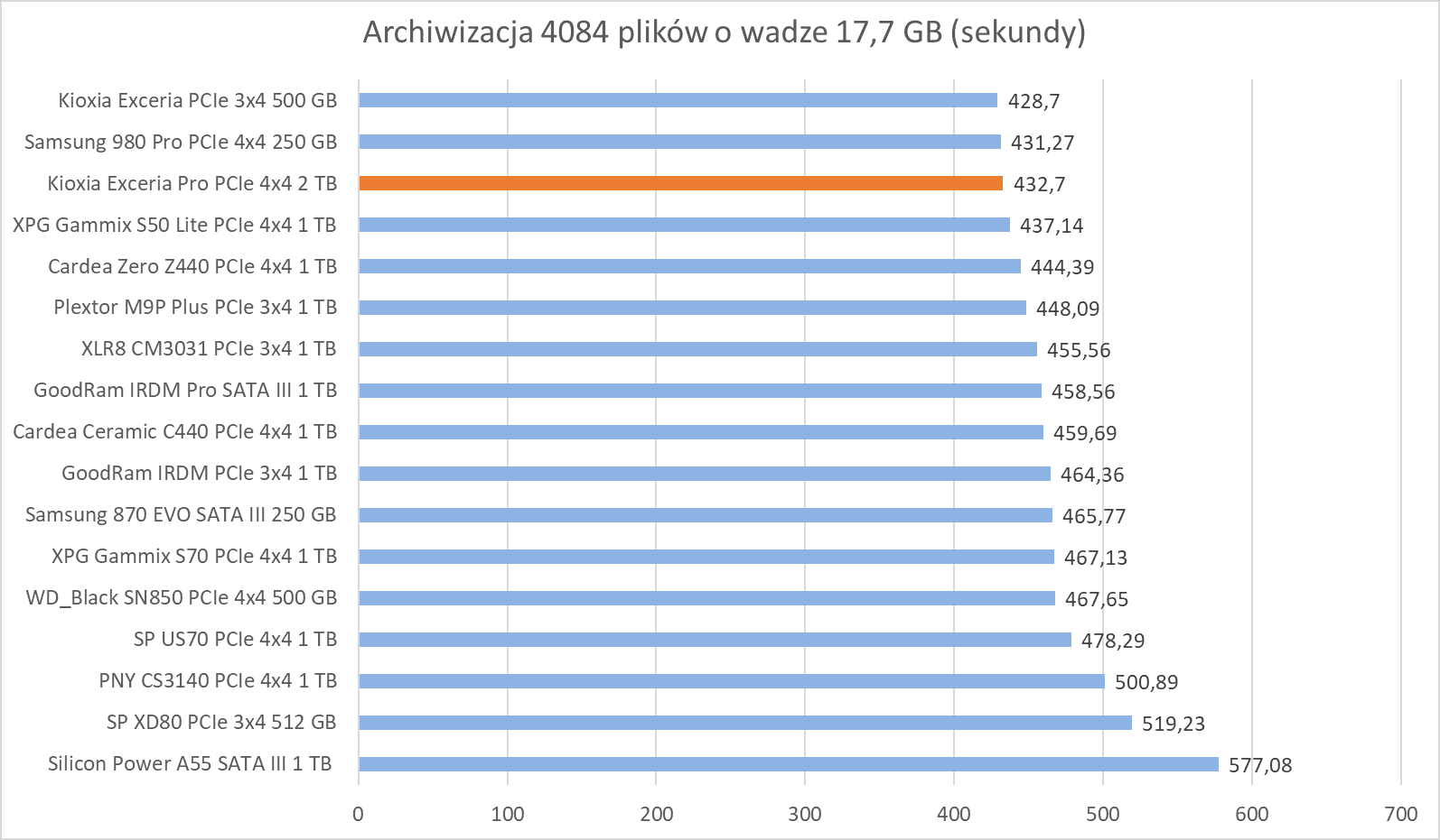 Dobra passa najwydajniejszego dysku konsumenckiego KIOXIA jest kontynuowana w programach i grach. Jeden rzut oka na pomarańczowy wykres, przedstawiający dominację modelu Exceria Pro świadczy o tym z nawiązką, ale oczywiście momentami różnice są naprawdę niewielkie.