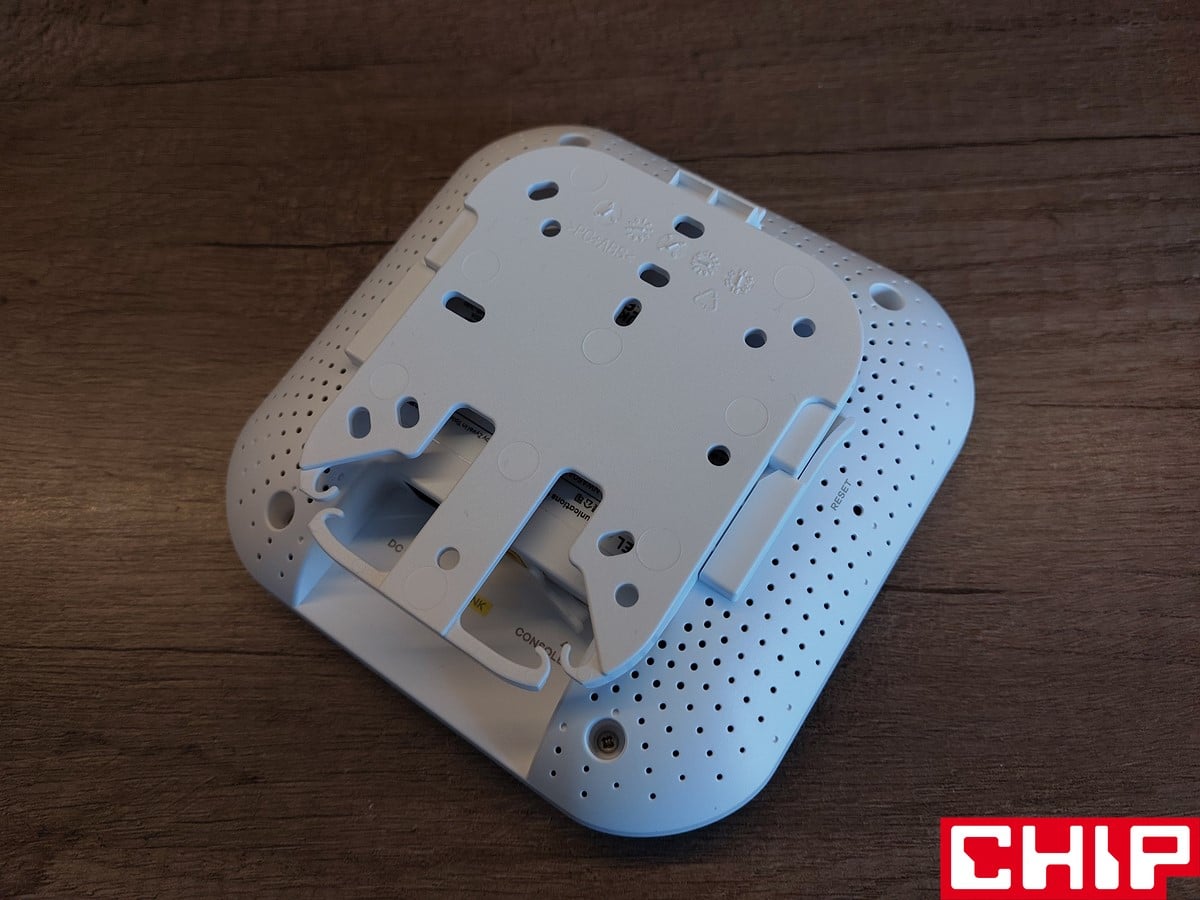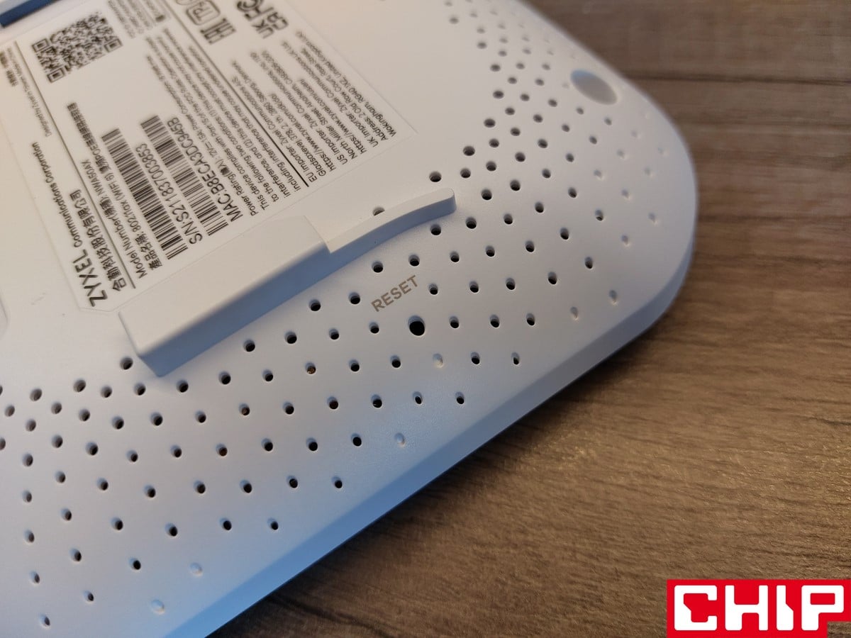 Najważniejsze elementy NWA50AX sprowadzają się do diody informacyjnej w prawym dolnym rogu urządzenia, ukrytego pod jedną z dziurek przycisku resetu do ustawień fabrycznych oraz sekcji portów (okrągły do zasilania, tradycyjny Ethernet i zaślepiony port dla konsoli). Poza tym punkt dostępowy posiada wsuwany na małe uchwyty opcjonalny zestaw montażowy.