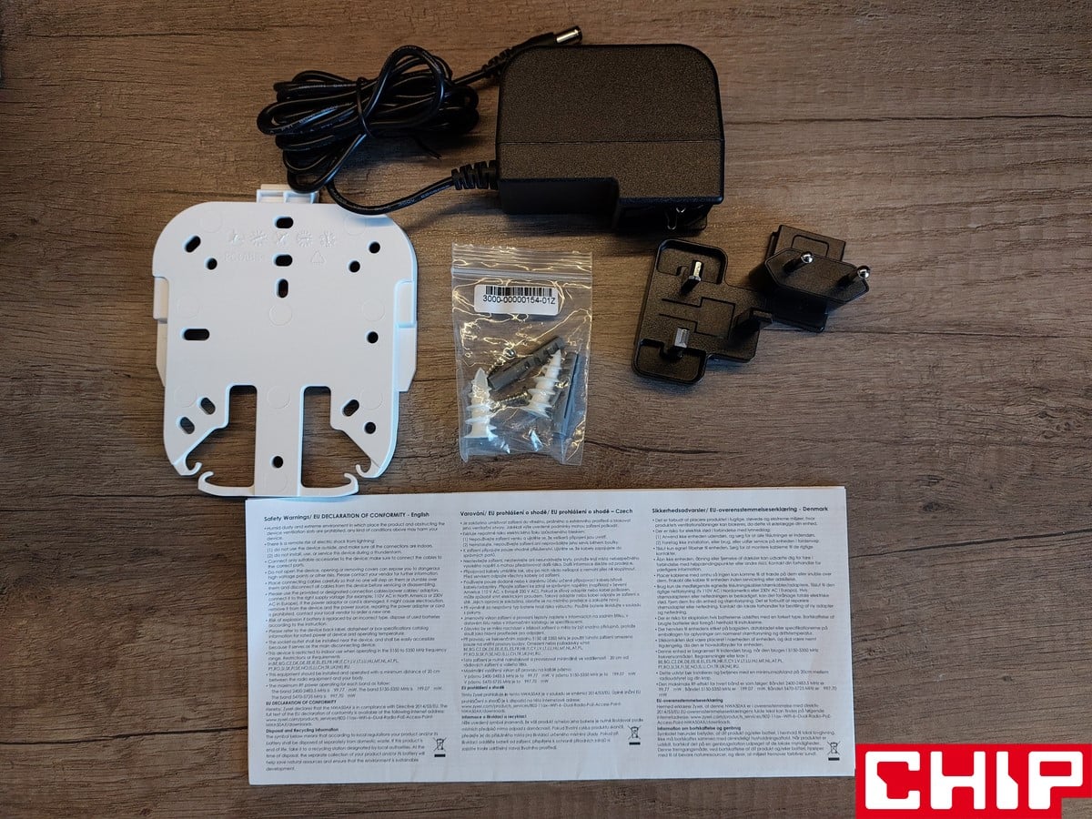 Trafiający do nas w kartonowym, ewidentnie proekologicznym pudełku punkt dostępowy Zyxel NWA50AX zawiera trzy ważne elementy w zestawie (poza samym Access Pointem), bo zasilacz 12V z przejściówką, ramkę montażową oraz zestaw kołków do ewentualnego montażu na ścianie.
