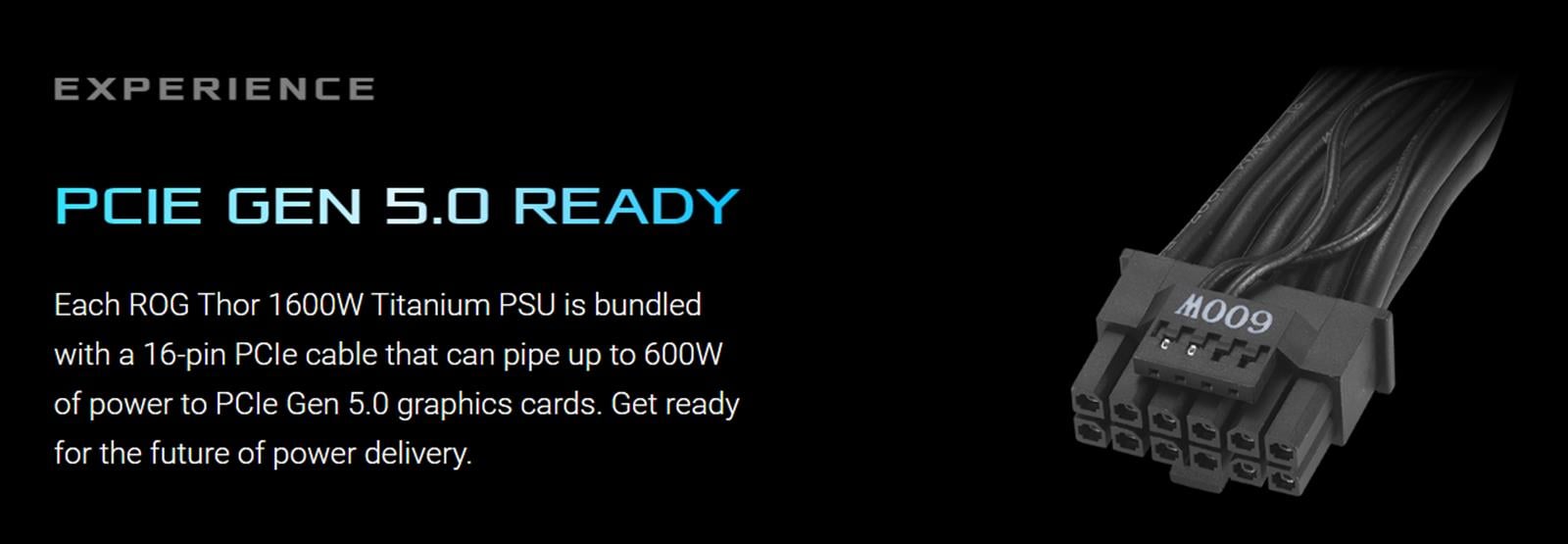 Z wyglądu ten zasilacz przypomina w dużym stopniu ROG Thor II, łącząc czerń i srebro z lazurowymi ozdóbkami oraz ekranem OLED na boku. Jednak to, co jest najważniejsze, to zapewnianie przez niego nawet 1600 watów mocy (obyśmy nigdy takich ilości nie potrzebowali), które najwyraźniej nie trafią do karty graficznej nowej generacji bezpośrednio, a przez adaptery.