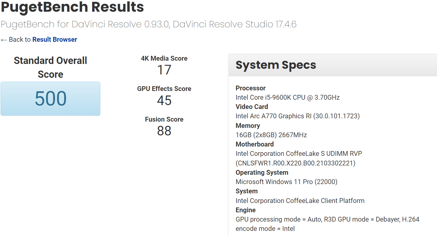 Ten model został przetestowany w benchmarku Puget Bench DaVinci Resolve i najwyraźniej korzysta z nowej gałęzi sterowników, która nie została jeszcze udostępniona publicznie. Nic w tym dziwnego, bo niewydany sprzęt korzysta zazwyczaj ze starszych lub zupełnie innych gałęzi sterowników i w tym przypadku mamy do czynienia ze sterownikiem w wersji 30.0.101.1723. Ten jest znacznie nowszy od dostępnego obecnie oficjalnego sterownika Intel Arc “1330”, który został udostępniony 8 kwietnia. Oczywiście, o ile uznamy, że Intel połączy sterowniki dla kart mobilnych i desktopowych.