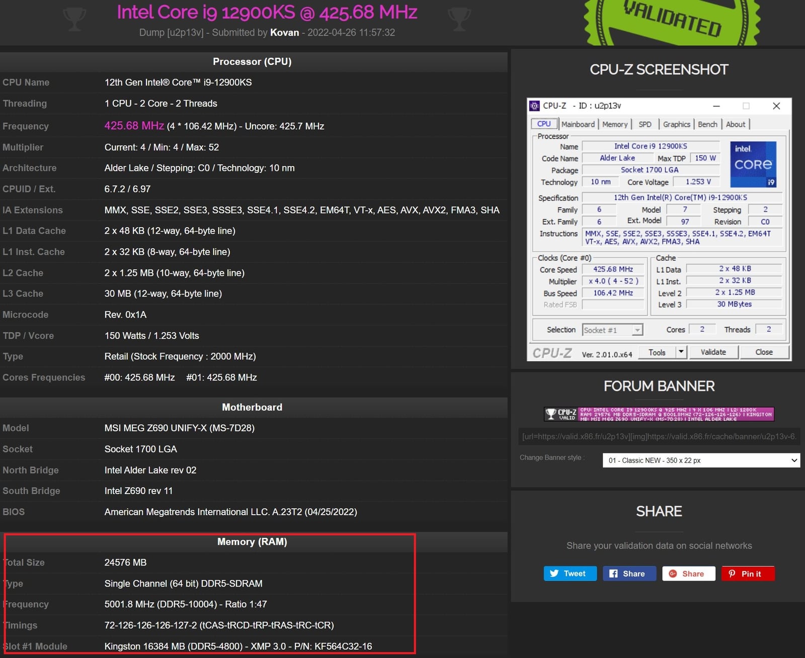 Do testu i ekstremalnego OC, które musiało obejmować wykorzystanie ciekłego azotu, wykorzystano płytę główną MSI UNIFY-X z tylko dwoma slotami DDR5 oraz procesor Core i9-12900KS. Ten ograniczono do wyłącznie 2 rdzeni pracujących na częstotliwości 425 MHz, co najwyraźniej zapewniło pamięci najlepsze warunki jeśli chodzi o stabilność.