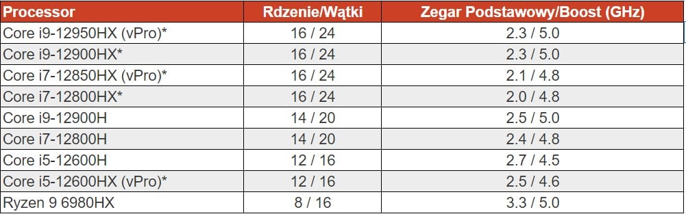 Powyżej możecie podejrzeć, jak procesory będą prezentować się na tyle zarówno Ryzena 9 6980HX, czyli flagowca AMD, jak i dotychczasowych mobilnych układów Core. Według nieoficjalnych jeszcze informacji, najpotężniejszy procesor Core i9-12950HX będzie oferował wspomniane 24 wątki, dzięki konfiguracji 8+8, co sprawi, że na tle oferty AMD będzie znacząco odróżniał się liczbą rdzeni (to może zgubić niezaznajomionych z rynkiem), oferując przy tym zegar podstawowy na poziomie 2,3 GHz i 5 GHz w trybie Boost.