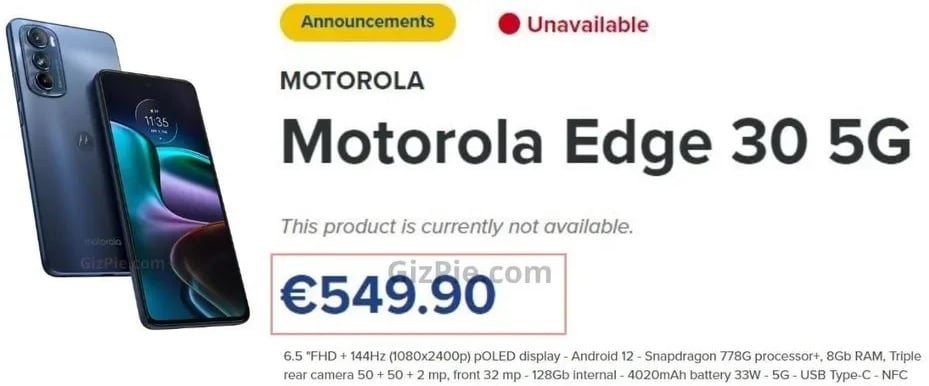 Na zrzucie ekranu widać też kilka szczegółów specyfikacji, które potwierdzają to, czego do tej pory dowiedzieliśmy się o Edge 30 5G. Smartfon napędzany będzie przez procesor Qualcomm Snapdragon 778G+. Wcześniej mówiło się, że ma pojawić się wariant z 6 GB RAM i opcja z 256 GB pamięci masowej. Na pokładzie znajdzie się Android 12 i bateria 4020 mAh z obsługą szybkiego ładowania z mocą 33W. Nie zabraknie też USB-C i NFC.