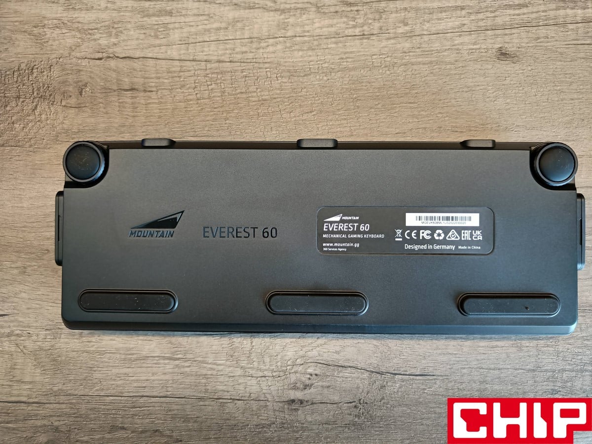 Przechodząc na spód, od razu w nasze oczy rzucą się trzy podłużne, grube antypoślizgowe wstawki z gumy, które w połączeniu z podobnie zaawansowanymi podkładkami w górnych rogach wręcz “przyklejają” klawiaturę do blatu. Samo zwiększanie kąta nachylenia Everest 60 zostało ciekawie zrealizowane, bo zamiast nóżek, które można złamać, Mountain postawił na łącznie sześć namagnesowanych krążków z jedną parą uzupełnioną wspomnianą gumą.