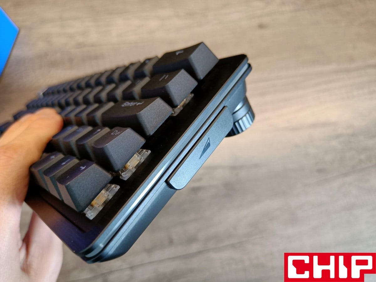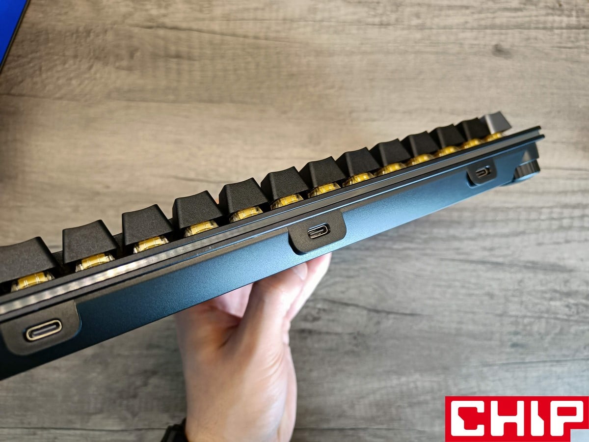 Na lewym i prawym boku znajdziecie z kolei zaślepiony port i parę luk z magnesami prostym kawałeczkiem plastiku sygnowanym logo producenta. To tam możecie wpiąć bezpośrednio opcjonalny i dodatkowo płatny moduł klawiszy numerycznych, który zgrywa się wizualnie z klawiaturą. Dzięki temu rozwiązaniu możecie np. przenieść ten panel na lewą stronę klawiatury. Wprawdzie połączenie nie jest idealne, bo jest zbyt słabe (uniemożliwia podniesienie klawiatury przy chwycie “po bokach”), ale posuwanie całości po blacie nie powoduje odpinania się.