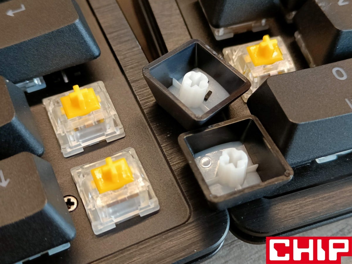 To “tradycyjne Redy” z 4-mm drogą działania, 2-mm punktem aktywacji, liniową charakterystyką i potrzebnym naciskiem rzędu 45 gramów. Ich wytrzymałość szacuje się na 100 mln aktywacji, a moja subiektywna ocena ich działania jest na wskroś pozytywna, bo razem z wysoką responsywnością klawisze cechuje też przyjemne dla ucha i palców subtelne tłumienie każdego kliku. Co najlepsze, w razie potrzeby możecie wymienić te przełączniki na jakiekolwiek kompatybilne odpowiedniki z 5- lub 3-pinami.