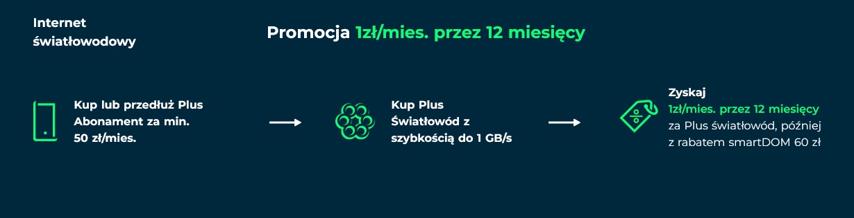 Różnica polega na tym, że jeśli nie mamy abonamentu głosowego w Plusie, Internet światłowodowy możemy mieć za złotówkę miesięcznie, przez okres 6 miesięcy. Po tym okresie za Internet będziemy płacić 70 zł miesięcznie (z rabatem za e-fakturę). Jeśli kupimy lub przedłużymy umowę na abonament głosowy lub internet mobilny w kwocie minimum 50 zł miesięcznie, okres promocji wydłuża się do 12 miesięcy. Po tym czasie czym cena Internetu to 60 zł, ze względu na 10 zł rabatu smartDOM (i z rabatem za e-fakturę).