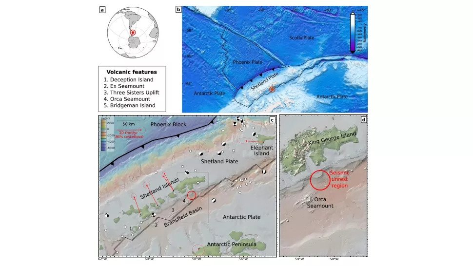Okazał się nim podwodny wulkan znany jako Orca Seamount zlokalizowany w pobliżu Wyspy Króla Jerzego. Ten nieaktywny obiekt ma około 900 metrów wysokości i znajduje się w Cieśninie Bransfielda, wąskim przejściu między Południowymi Szetlandami a północno-zachodnim krańcem Antarktydy. To właśnie tam płyta tektoniczna Phoenix zanurza się pod kontynentalną płytę antarktyczną, tworząc sieć stref uskoków, co z kolei przekłada się na podwyższoną aktywność sejsmiczną.