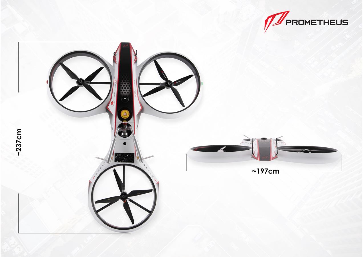 Każdy silnik zajmuje się napędzeniem tylko jednego śmigła, z czego każda sekcja zabezpieczona po bokach posiada parę śmigieł i silników. Nie odbija się to jednak aż tak na wadze (arcyważnym parametrze w dronach), dzięki zastosowaniu ultralekkiej ramy z włókna węglowego wzmocnionego kevlarem o poziomie ochrony IP55. Przez to waga własna PROMETHEUS sięga 12 kilogramów, a ogółem maksymalna masa startowa wynosi 25 kilogramów (jest to podyktowane wymaganiami prawnymi) z czego pełen bak waży 8 kg, co zostawia 5 kg udźwigu do dyspozycji. Nieźle jak na drona o długości ~238 cm, szerokości ~200 cm i wysokości 35 cm.