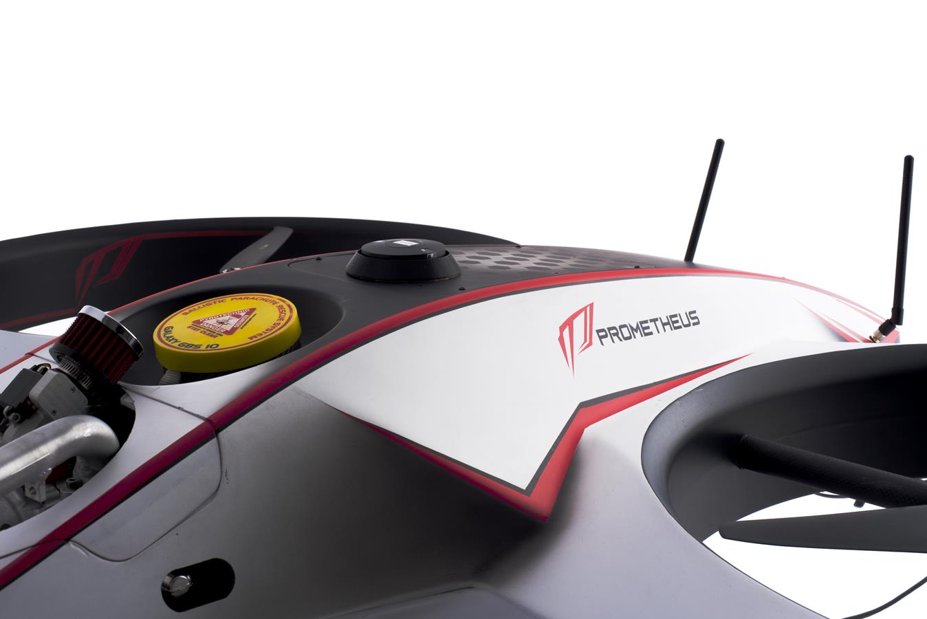 Brzmi to wprawdzie nierealnie, jako że akumulator to zwykle po prostu jednoczęściowy pakiet zestawu ogniw, a nie czynnie pracujący generator z bakiem, ale przy obecnym rozwoju technologii akumulatorowej to smutna rzeczywistość. Dlatego też w PROMETHEUS, dronie stricte hybrydowym, zastosowano 4,2-kilowatowy generator pokładowy na standardowe paliwo (Pb 95/98). Ten zasila sześć niezależnych silników poprzez 5000 mAh akumulator (lub bezpośrednio) za sprawą niezależnych torów zasilania.