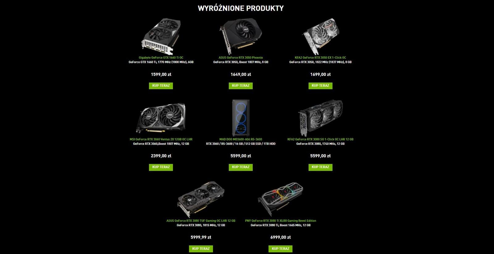 Firma nie zapomniała wskazać jednak na swojej stronie ofert, które mogą nas zainteresować. Według producenta to m.in. RTX 3080 Ti XLR8 Gaming od PNY (6999 zł), RTX 3080 TUF Gaming OC LHR od ASUSa (5999,99 zł) czy tańszy RTX 3080 SG LHR od KFA2 za 5599 zł. W przypadku mniej wydajnych modeli możecie liczyć na RTX 3060 Ventus 2X od MSI za 2399 zł czy RTX 3050 EX od KFA2 za 1699 zł, a najbardziej budżetowy segment obejmuje GTX 1660 Ti za 1599 zł.