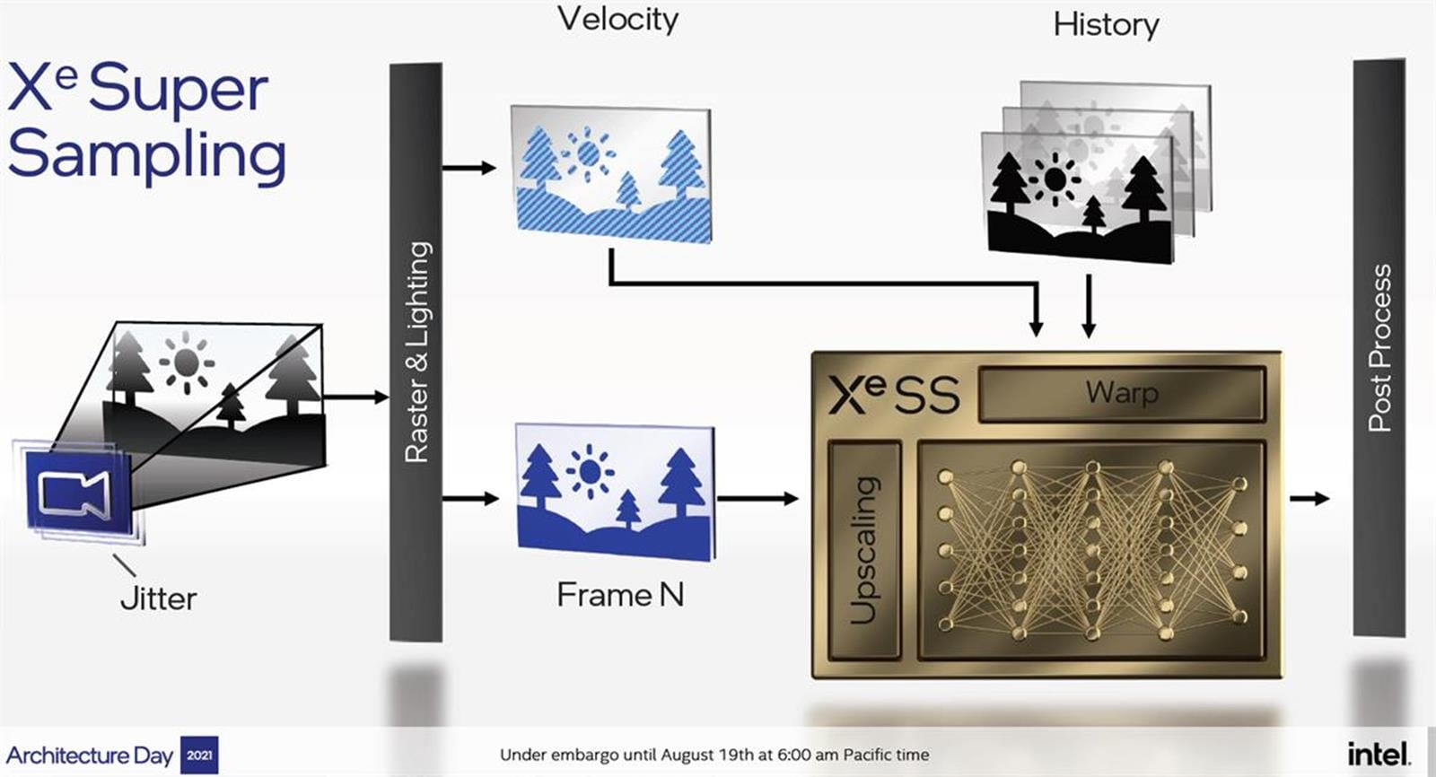 Jeśli idzie o same działanie technologii XeSS, to ta będzie uwzględniać wektory ruchu i historię poprzednich klatek obrazu. Do działania będzie wykorzystywać jednostki XMX Matrix Engine (odpowiadające za sztuczną inteligencję), które będą przetwarzać dane graficzne, zanim te dotrą do fazy postprocessingu.