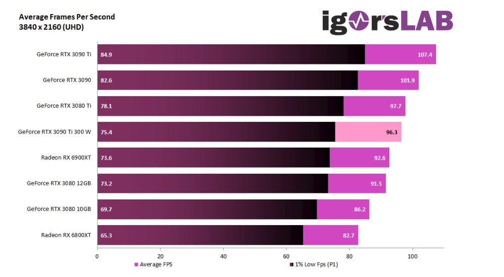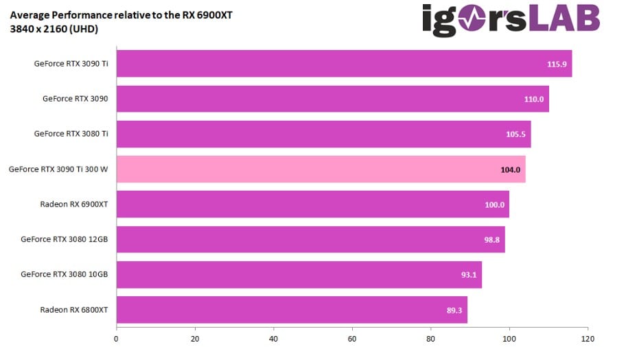 Po pomiarach okazało się, że ograniczony do poziomu 300 watów RTX 3090 Ti pobierał maksymalnie 314 watów, a odpowiadający mu wydajnością pełnoprawny RTX 3080 Ti całe 409 watów. Wskazuje to na ogromny wzrost wydajności energetycznej, które podkreśla pobór 319 watów przez średnio 16% wolniejszego Radeona RX 6800 XT oraz pobór 351 watów w przypadku RTX 3080 10 GB, który na dodatek zapewnia o ~11% niższą wydajność.
