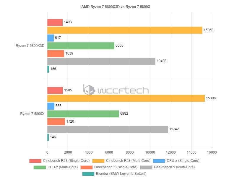 Stąd przewaga standardowego Ryzena 7 5800X nad Ryzenem 7 5800X3D rzędu nie tylko kilku, bo dobrych kilkunastu procent w tradycyjnych syntetykach. Dokładne porównanie przygotował serwis Wccftech i nam pozostaje żyć nadzieją, że w grach ta dodatkowa pamięć podręczna rzeczywiście zapewni wyższą wydajność.