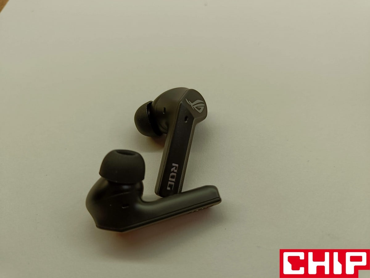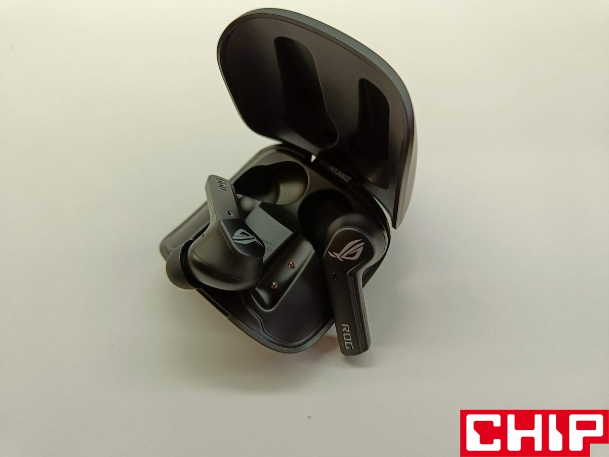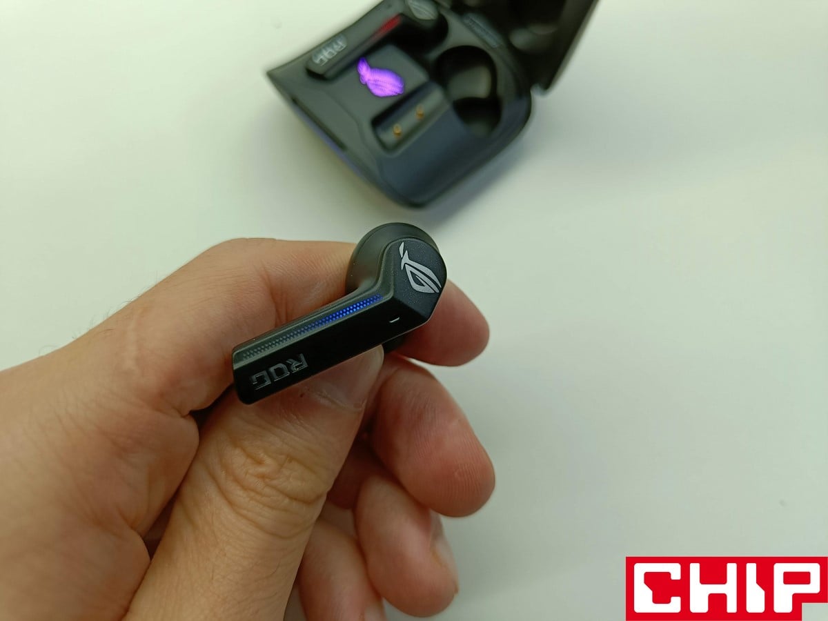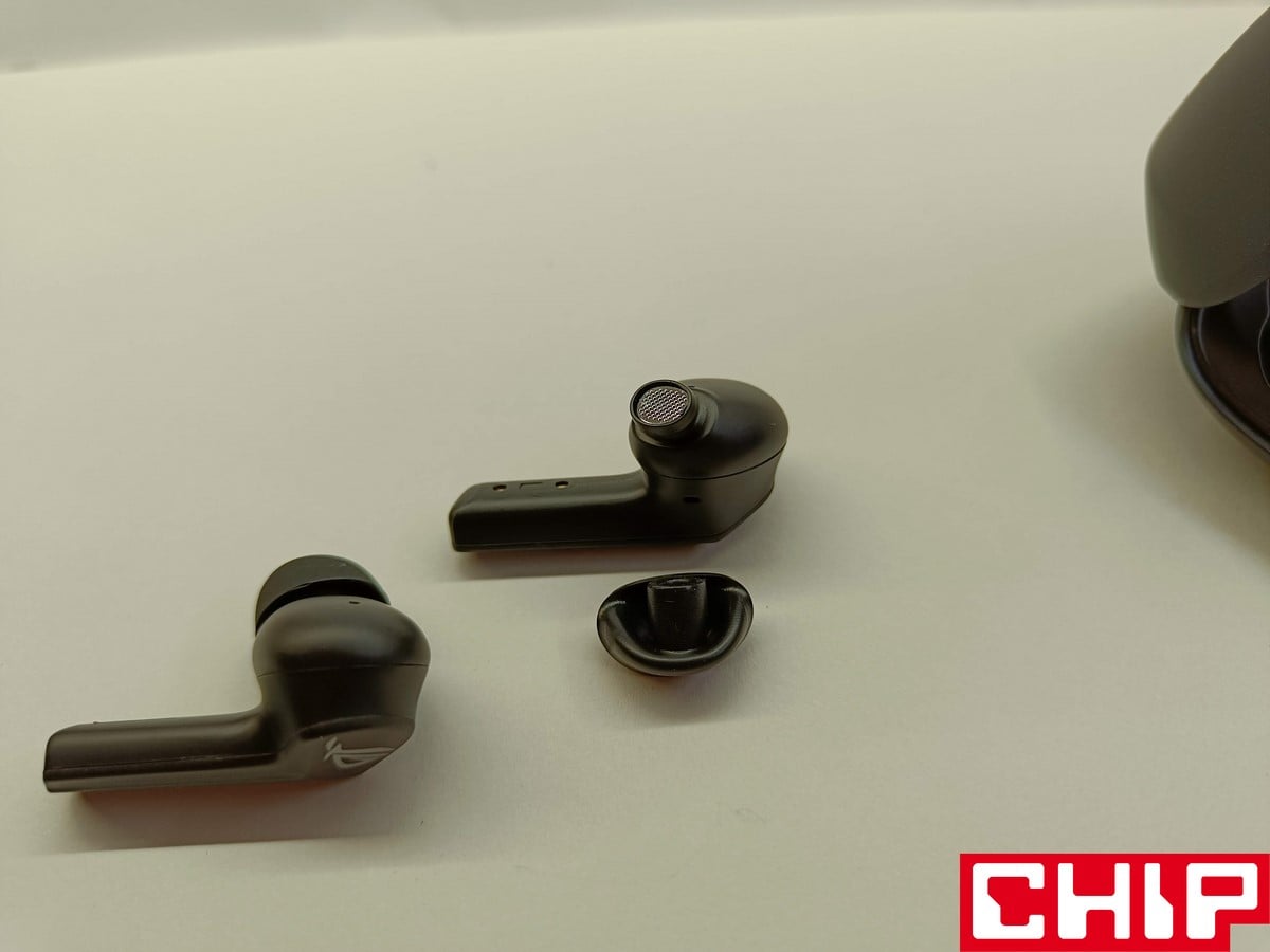 Jeśli idzie bezpośrednio o słuchawki opatrzone certyfikatem IPX4, to ASUS postawił na kultowe połączenie czerni i srebra w formie słuchawek “z łodyżką”, na której umieszczono zarówno wejścia mikrofonów, jak i styki ładujące oraz delikatne podświetlenie z zewnątrz (tuż pod fragmentem z widoczną siatką ozdobnych dziurek). O ile logo producenta jest “płaskie”, tak nazwa “ROG” została wygrawerowana.