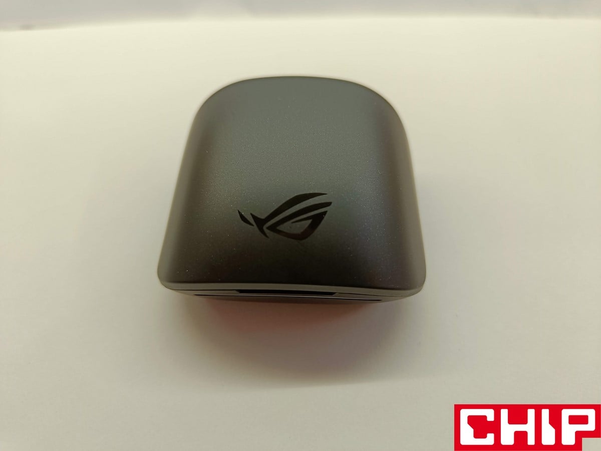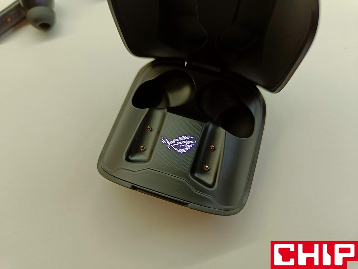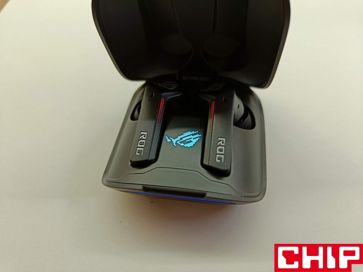Jest to podkreślone oświetleniem zarówno na przodzie etui, które informuje nas o poziomie naładowania wbudowanego w niego etui, jak i wewnątrz niego. Tyczy się to zarówno słuchawek, jak i podświetlane na wiele kolorów logo ASUSa w formie pixel-artu między nimi. Poza tym wewnątrz etui nic nie przyciąga naszej uwagi, bo poza dwoma parami pinów ładujących, znajduje się tam jeszcze niewidoczny magnes, utrzymujący słuchawki w ryzach.