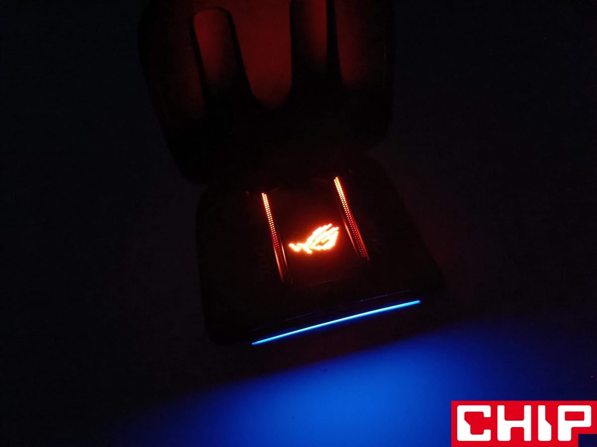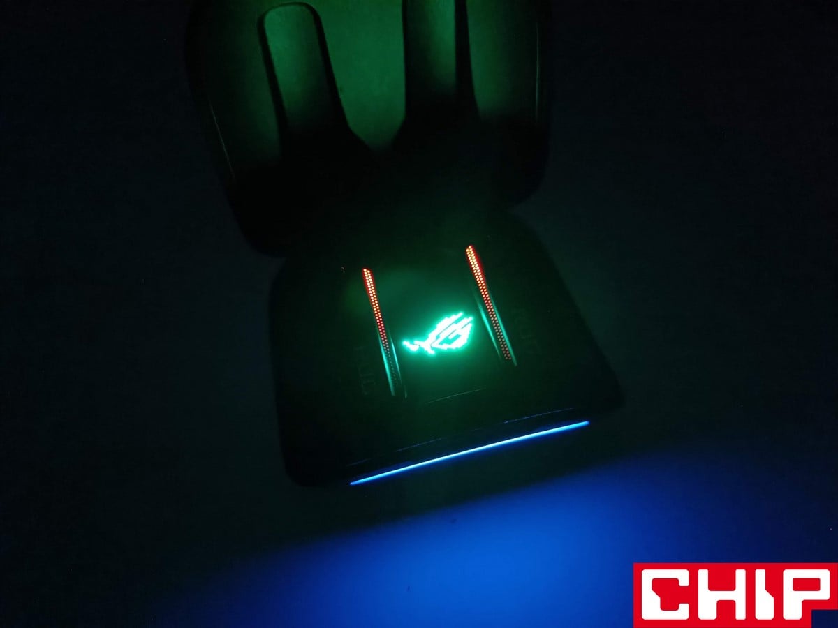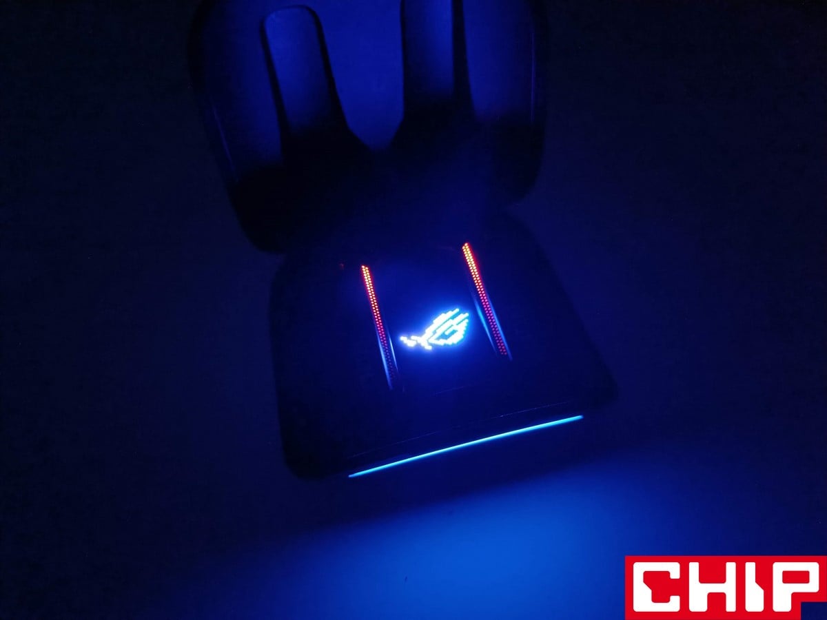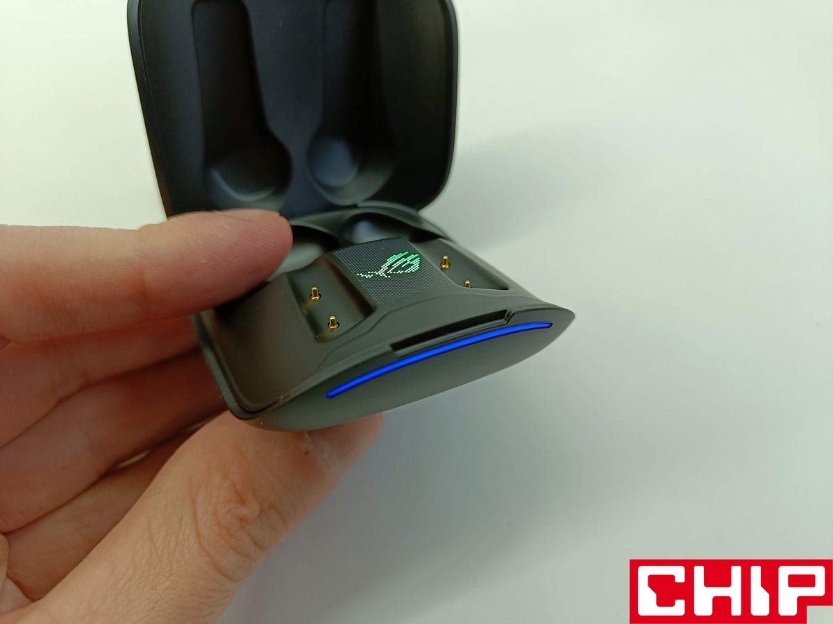 Jest to podkreślone oświetleniem zarówno na przodzie etui, które informuje nas o poziomie naładowania wbudowanego w niego etui, jak i wewnątrz niego. Tyczy się to zarówno słuchawek, jak i podświetlane na wiele kolorów logo ASUSa w formie pixel-artu między nimi. Poza tym wewnątrz etui nic nie przyciąga naszej uwagi, bo poza dwoma parami pinów ładujących, znajduje się tam jeszcze niewidoczny magnes, utrzymujący słuchawki w ryzach.