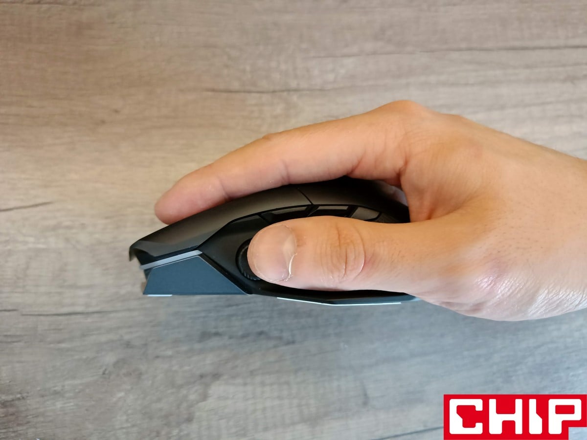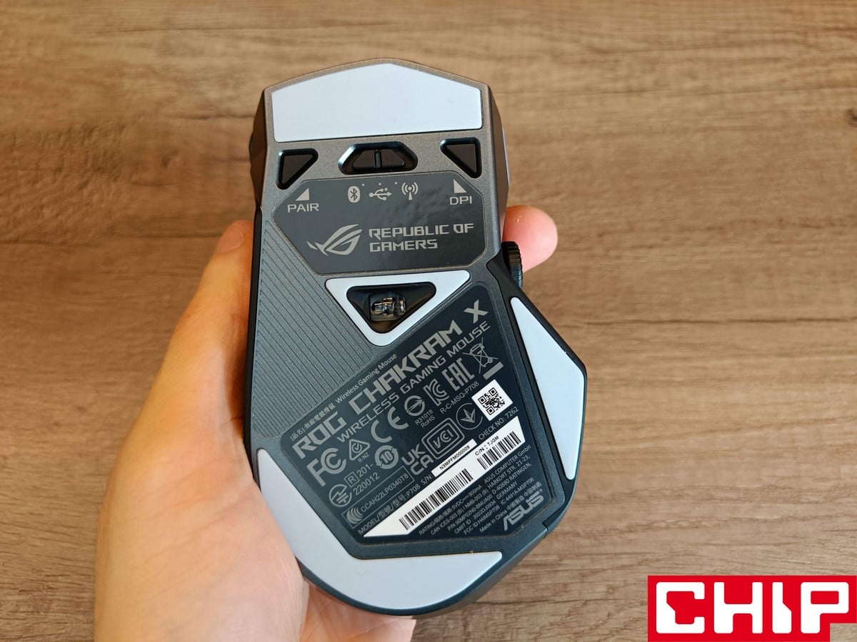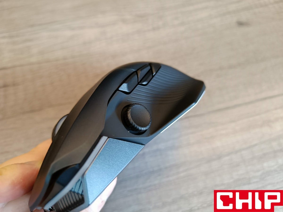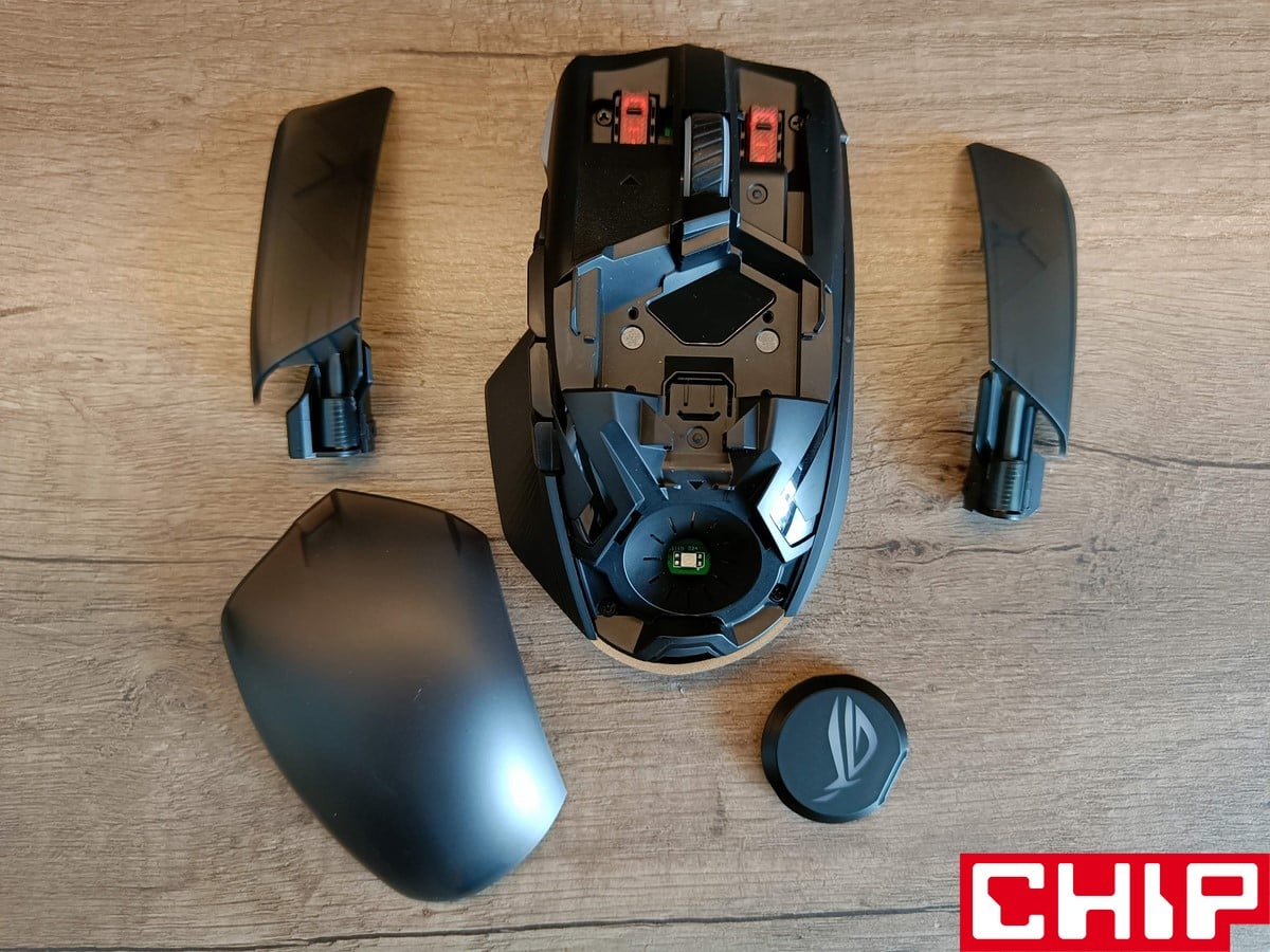 Możemy też zdecydować, czy pozostawimy podświetlone logo ASUSa pod przydymionym grzbietem obudowy (podświetlenie AURA znalazło się też pod rolką i przyciskami), czy może zastosujemy zaślepkę bez żadnego charakteru. Pod grzbietem znajduje się też miejsce na odbiornik USB, a z boku możemy wybrać, czy wolimy zaślepić gałkę joysticka, czy zamocować ją w formie niższej lub wyższej. Na boku znalazły się też dodatkowe dwa przyciski (względem oryginału), podczas gdy na spodzie oprócz czterech ślizgaczy znajdziemy też przełącznik obecnego trybu działania, przycisk DPI oraz przycisk parowania.