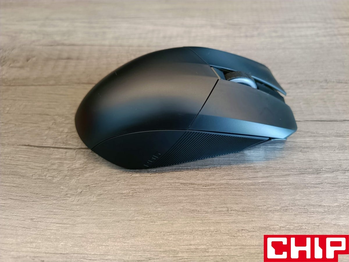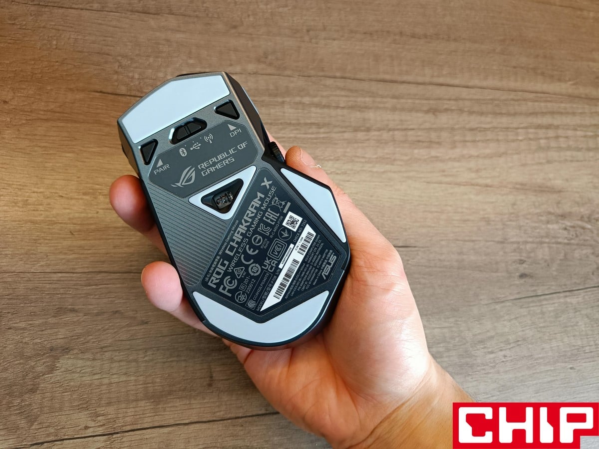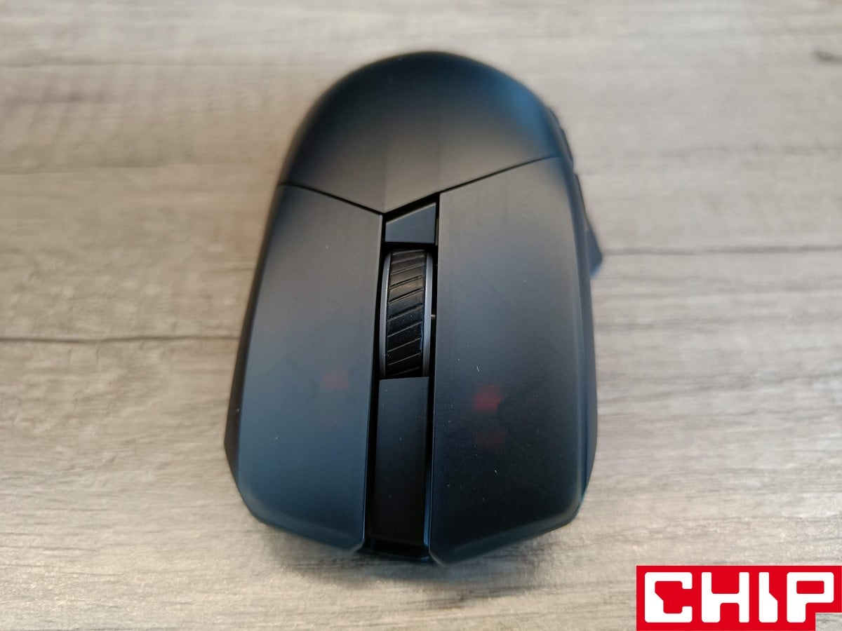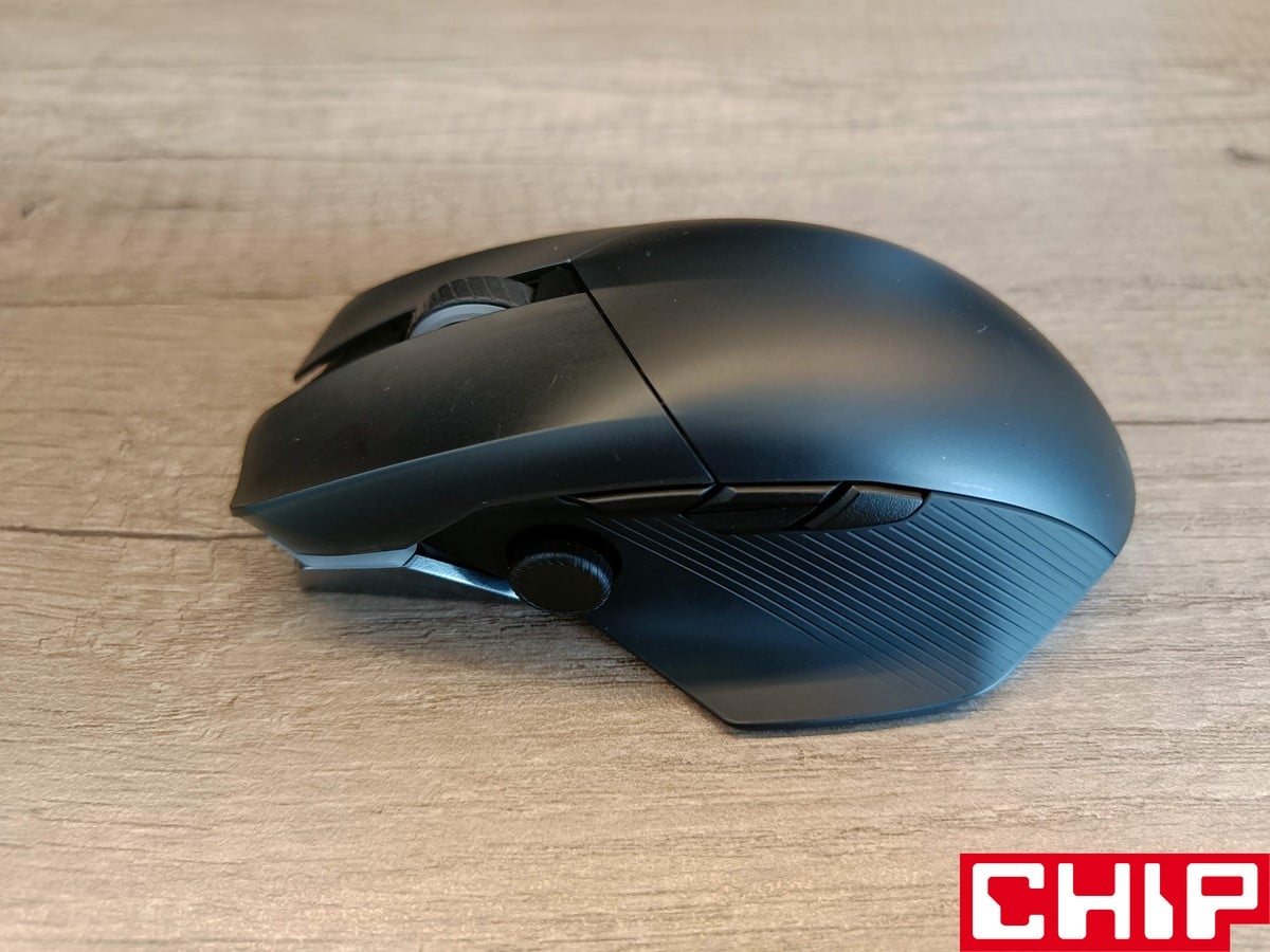 Możemy też zdecydować, czy pozostawimy podświetlone logo ASUSa pod przydymionym grzbietem obudowy (podświetlenie AURA znalazło się też pod rolką i przyciskami), czy może zastosujemy zaślepkę bez żadnego charakteru. Pod grzbietem znajduje się też miejsce na odbiornik USB, a z boku możemy wybrać, czy wolimy zaślepić gałkę joysticka, czy zamocować ją w formie niższej lub wyższej. Na boku znalazły się też dodatkowe dwa przyciski (względem oryginału), podczas gdy na spodzie oprócz czterech ślizgaczy znajdziemy też przełącznik obecnego trybu działania, przycisk DPI oraz przycisk parowania.