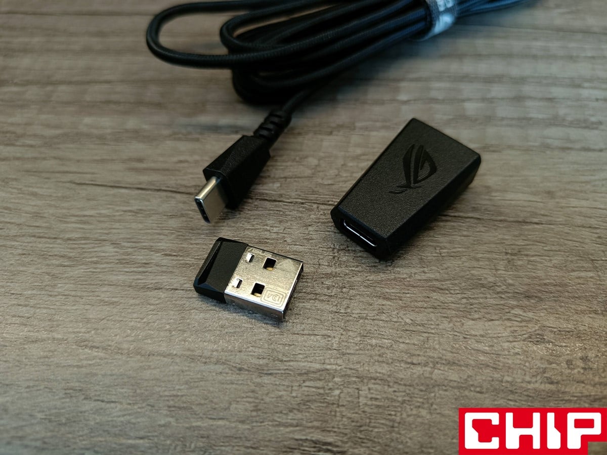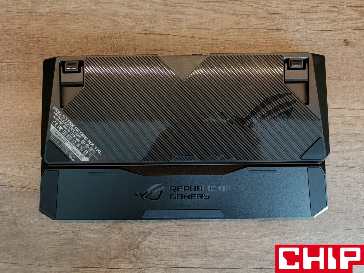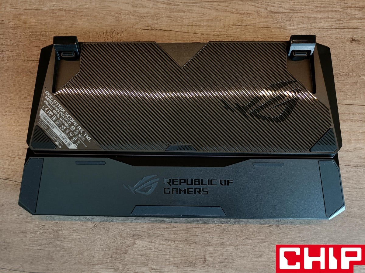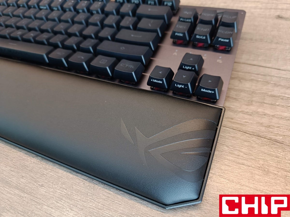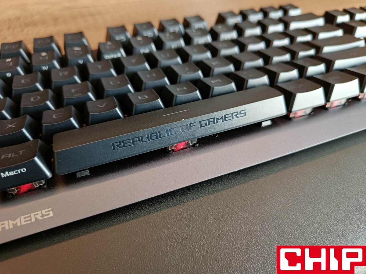 To wypadkowa szeregu fizycznych cech, które od razu rzucają się w oczy i komponują się ze sobą, ale nie zalatują kiczem, co tyczy się zwłaszcza górnego panelu z aluminium. Ten uzupełnia podświetlane i funkcyjne (może przedstawiać poziom naładowania) logo marki ROG w prawym górnym rogu, które wymusiło spadek diod informacyjnych nad strzałki i pozbawienie klawiatury standardowego klawisza Print-Screen, Scroll-Lock i Pause Break (dwa pierwsze ukryto w formie funkcji).