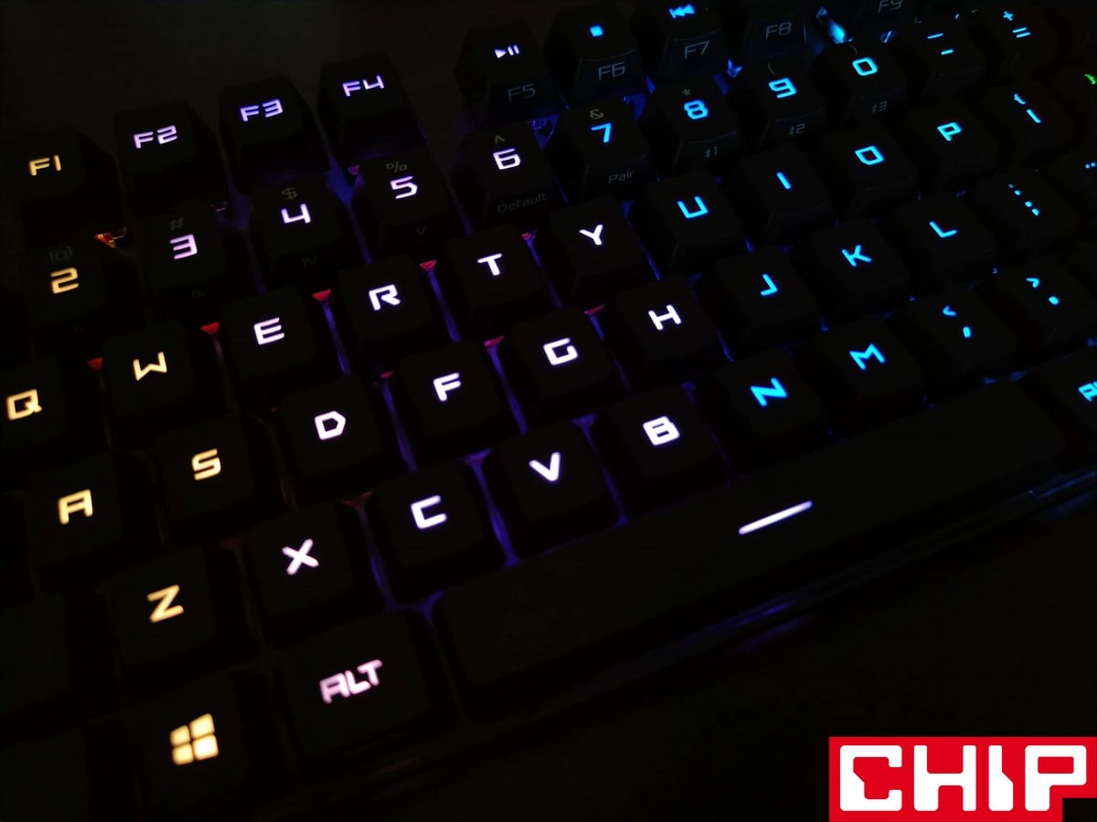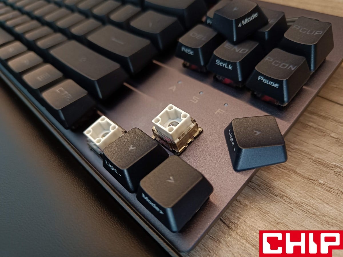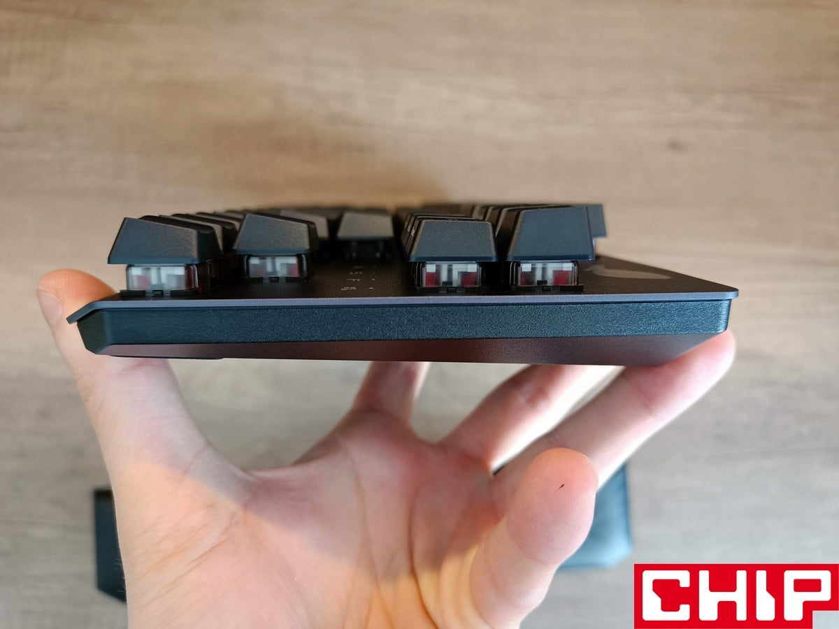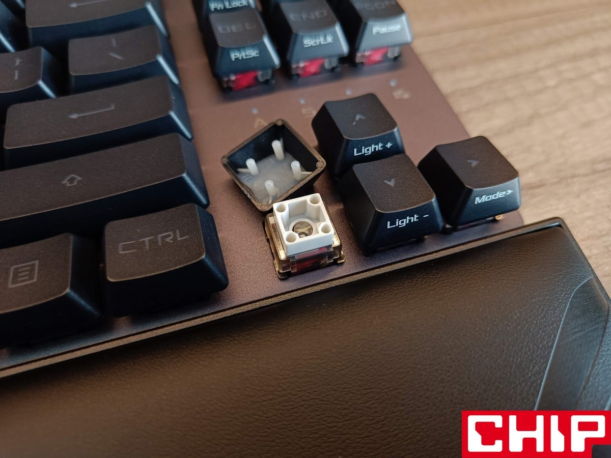 ASUS sprzedaje tę klawiaturę w wersji z przełącznikami Blue lub Red, z czego w moje ręce trafiła ta druga, cechując się wytrzymałością do 100 mln aktywacji, 4-mm drogą pracy, aktywacją na poziomie ~1,5 mm oraz siłą potrzebną do wciśnięcia rzędu 40 i 55 gramów (odpowiednio siła wymagana do początkowego poruszenia przełącznikiem i dociśnięcia go do samego końca). Jak to się sprawdza w praktyce? Zgodnie z oczekiwaniem, bardzo “premium”. Aktywacja zachodzi bardzo szybko, przełączniki zachowują stały charakter pracy na całej długości, a ich sposób działania można określić właśnie wspomnianym wyżej słowem “czegoś premium”.