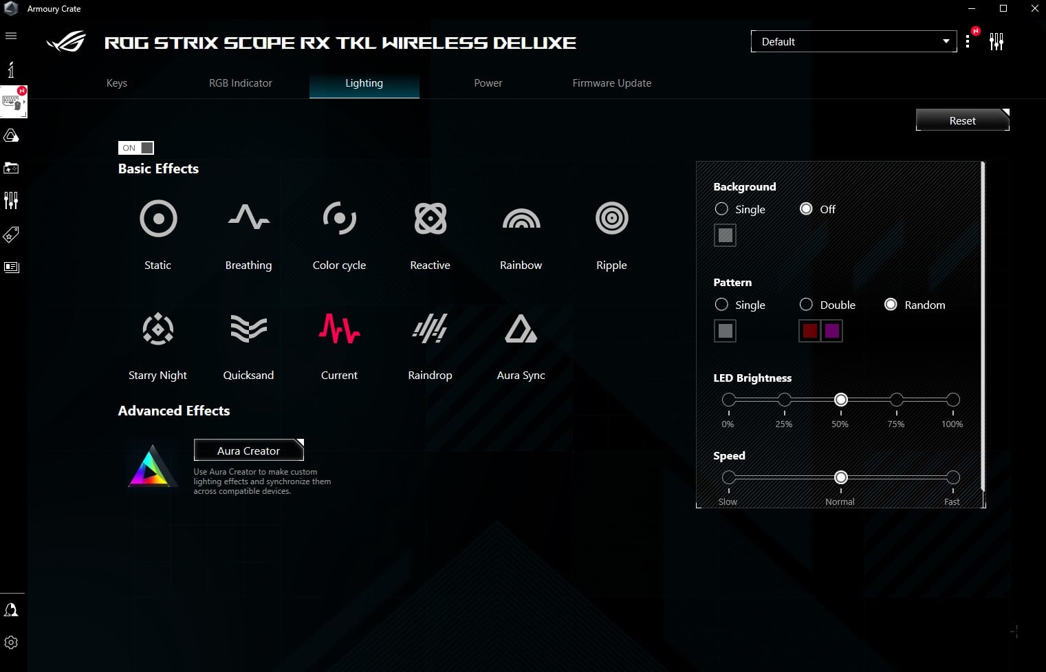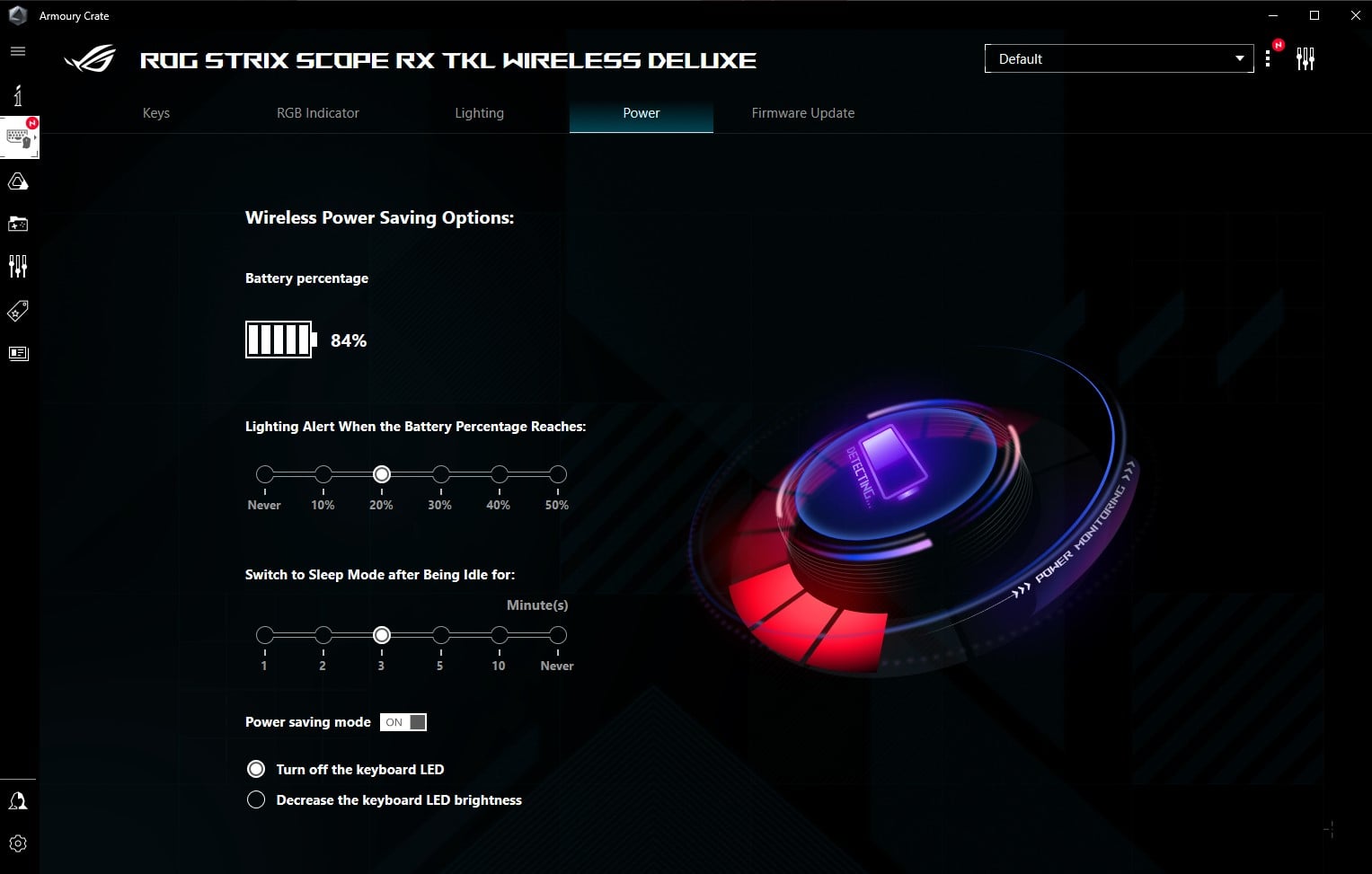 Aplikacja ROG Armoury została zdecydowanie poprawiona przez ASUSa w myśl stabilności w ciągu ostatnich miesięcy, więc już nawet pierwsze chwile z konfiguracją ROG Strix Scope RX TKL Wireless były dla mnie przyjemne. Samo oprogramowanie jest zresztą również intuicyjne, pozwala dostosować zaawansowane efekty podświetlenia, podmienić funkcje klawiszy, ustawić sposób działania trybu gamingowego, wskazać tryb działania podświetlanego logo i wreszcie dostosować sposób działania w myśl możliwie najdłuższego oszczędzania wbudowanego akumulatora.