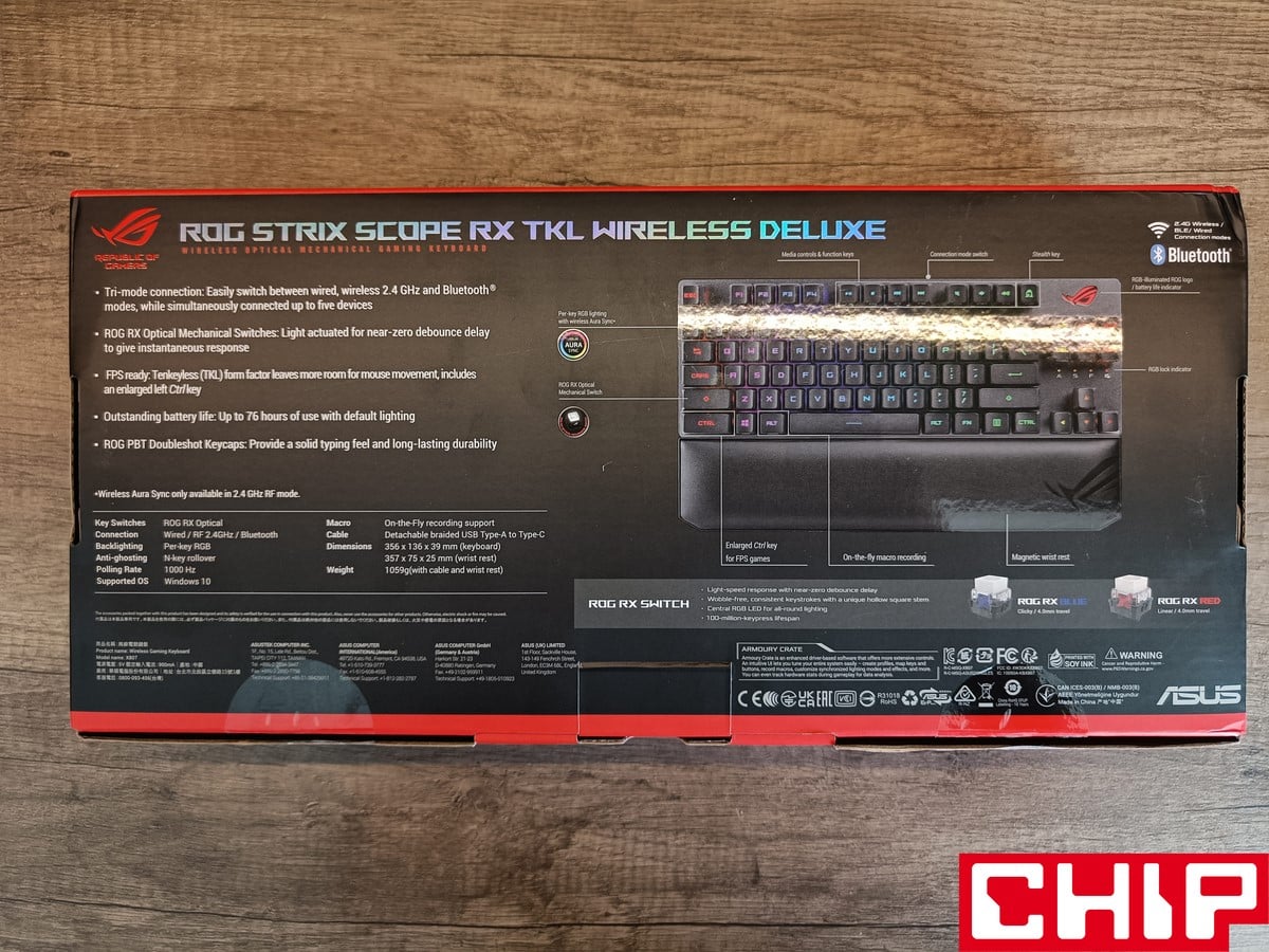 Poszczególne elementy nie są zaskoczeniem, jak na bezprzewodową klawiaturę tej klasy. Czego brakuje? Przede wszystkim solidniejszego etui do transportu, jako że to model TKL, czyli teoretycznie stworzony z myślą o transporcie. Dodatek podkładki jest za to świetnym dodatkiem, a ogólna jej jakość mówi sama za siebie co do półki cenowej, w której plasuje się ASUS ROG Strix Scope RX TKL Wireless.