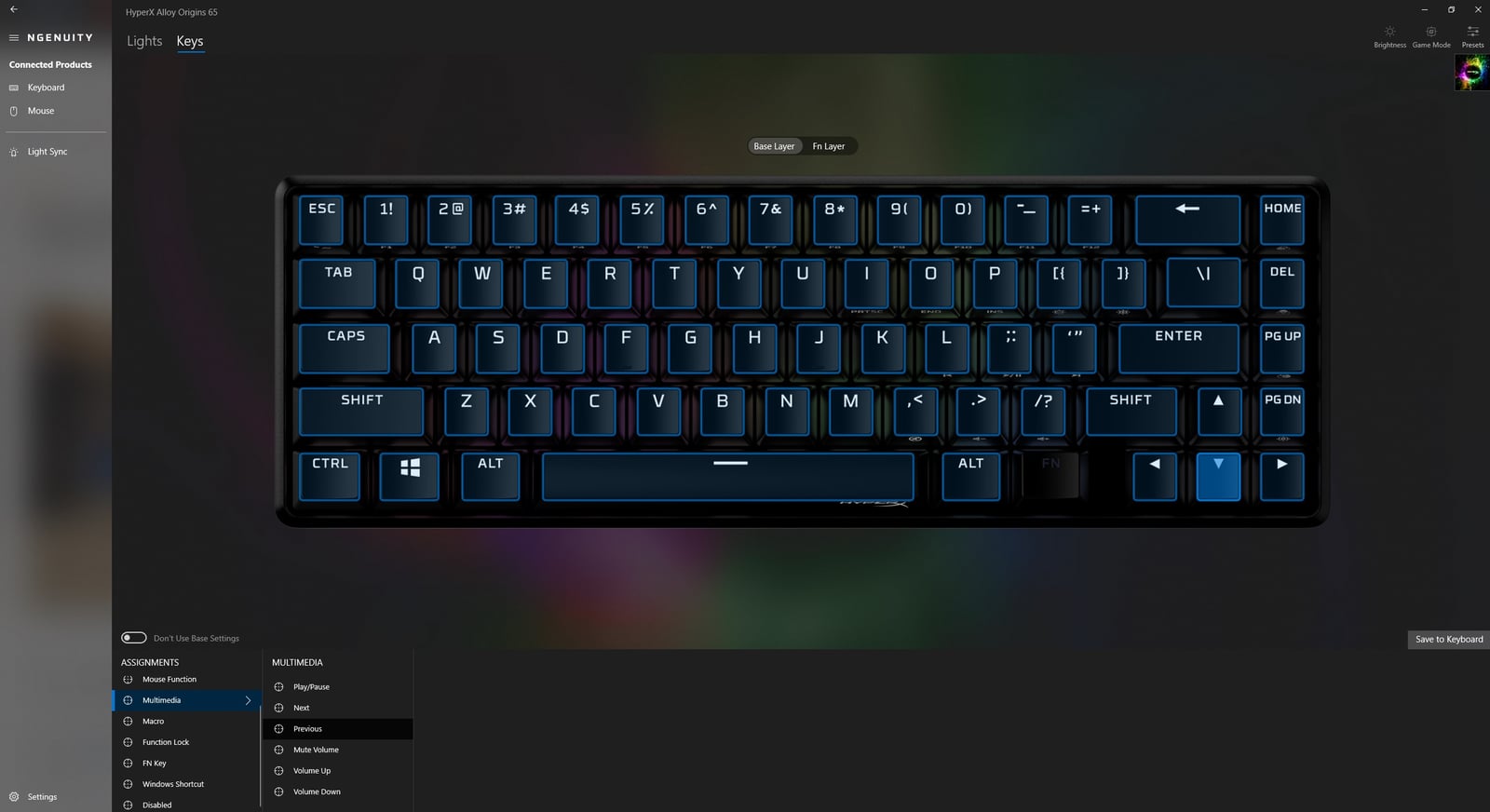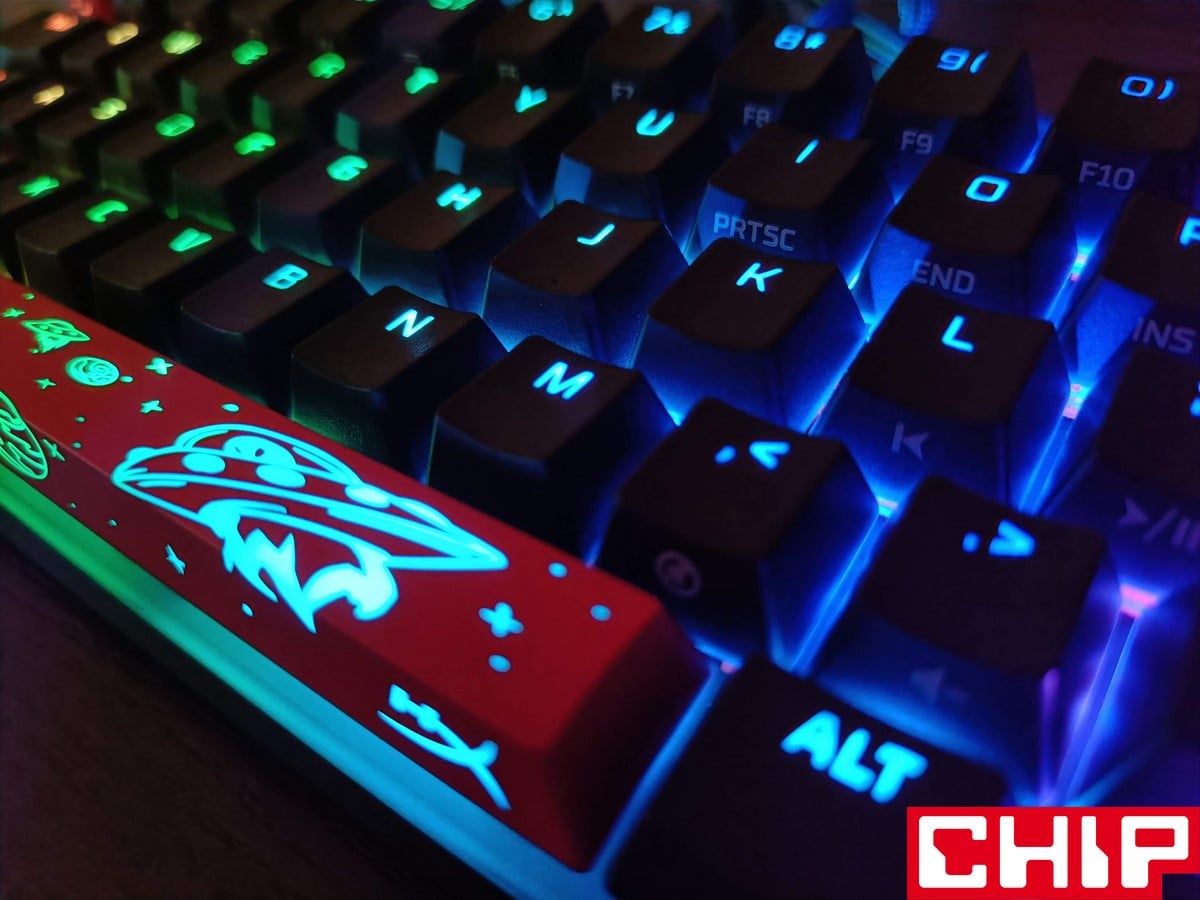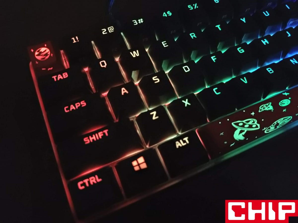 W HyperX Alloy Origins 65 zaimplementowano świetny system podświetlenia, na który składają się wyciągnięte nad przełącznik jasne diody RGB oraz świetnie wykrojona czcionka. Efekt tego połączenia widać zwłaszcza w przypadku dodatkowego klawisza spacji ozdobionego w kosmicznym wręcz stylu. Jak już opisywałem przy oprogramowaniu, w aplikacji NGenuity mamy możliwość dostosować podświetlenie na wielu frontach, ale ten najważniejszy sprowadza się do dowolnego łączenia ze sobą efektów z rozróżnieniem na poszczególne diody.