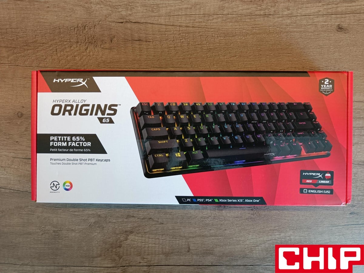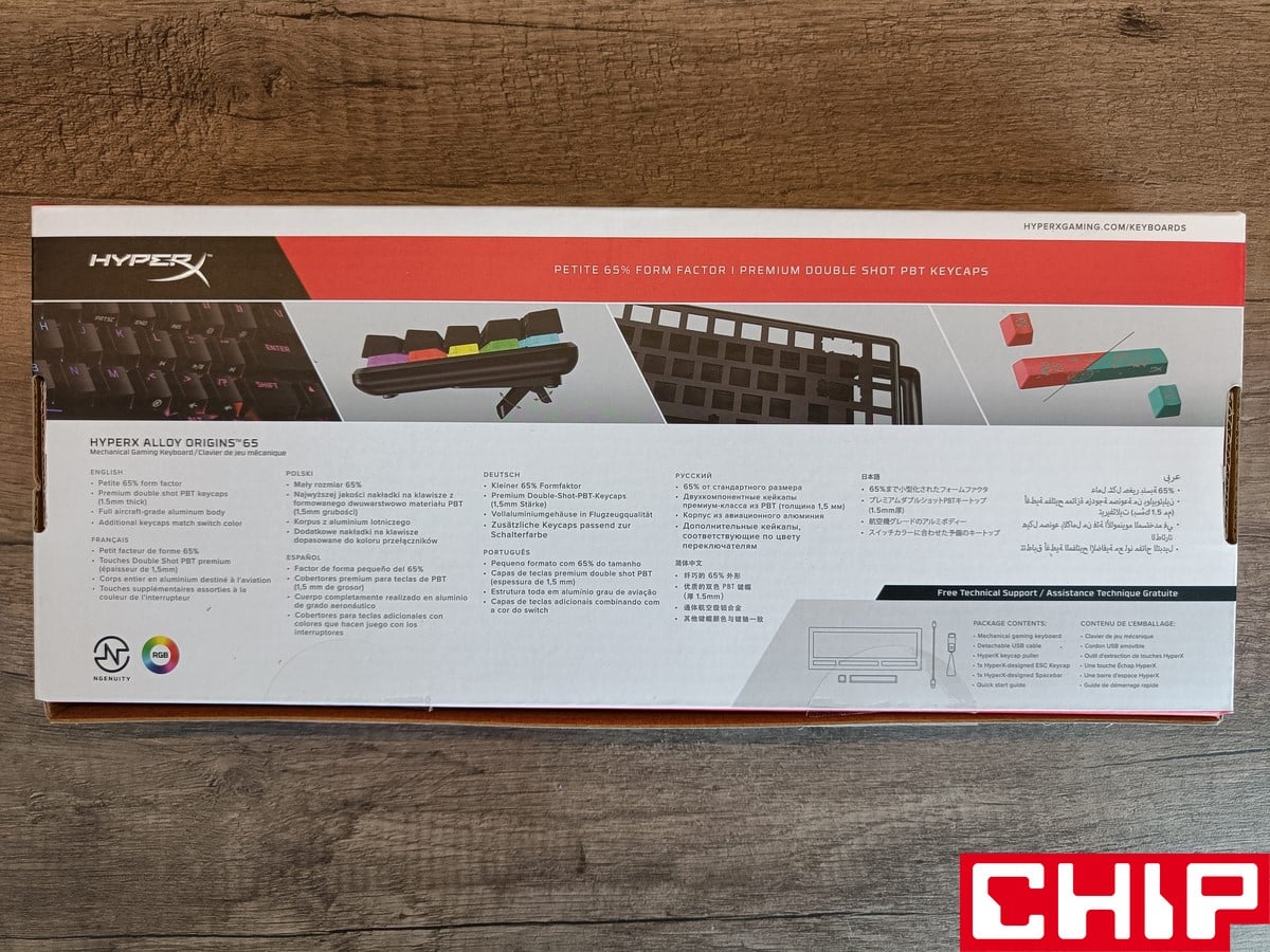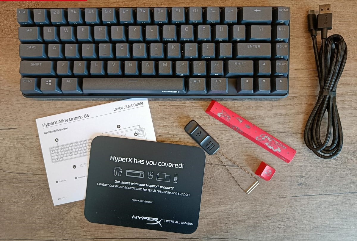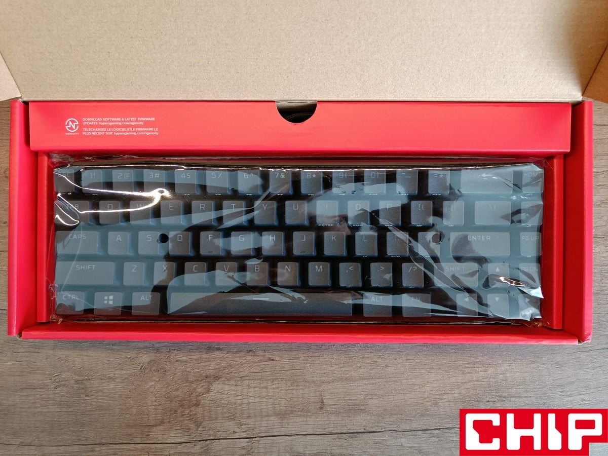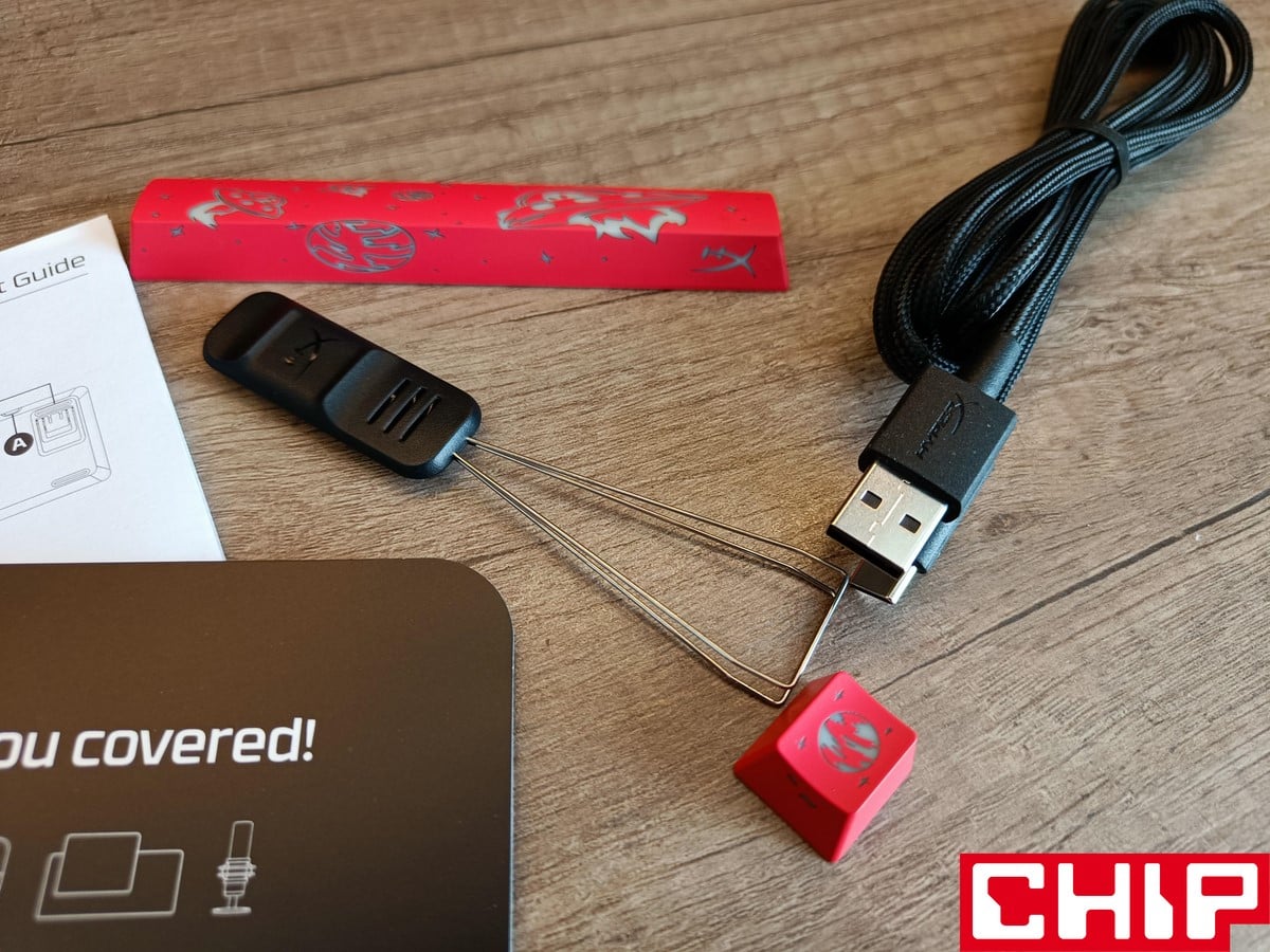 Skromne, ale wizualnie atrakcyjne i wpisujące się w obecny charakter HyperX pudełko z jednej strony pozwala zapoznać się z najważniejszymi cechami produktu, a z drugiej zapewnia odpowiednią ochronę w transporcie. Wewnątrz znajdziemy instrukcję obsługi, ulotkę, przewód USB-A do USB-C w materiałowym oplocie, dwa wymienne klawisze i wreszcie kluczyk do ściągania keycapów.