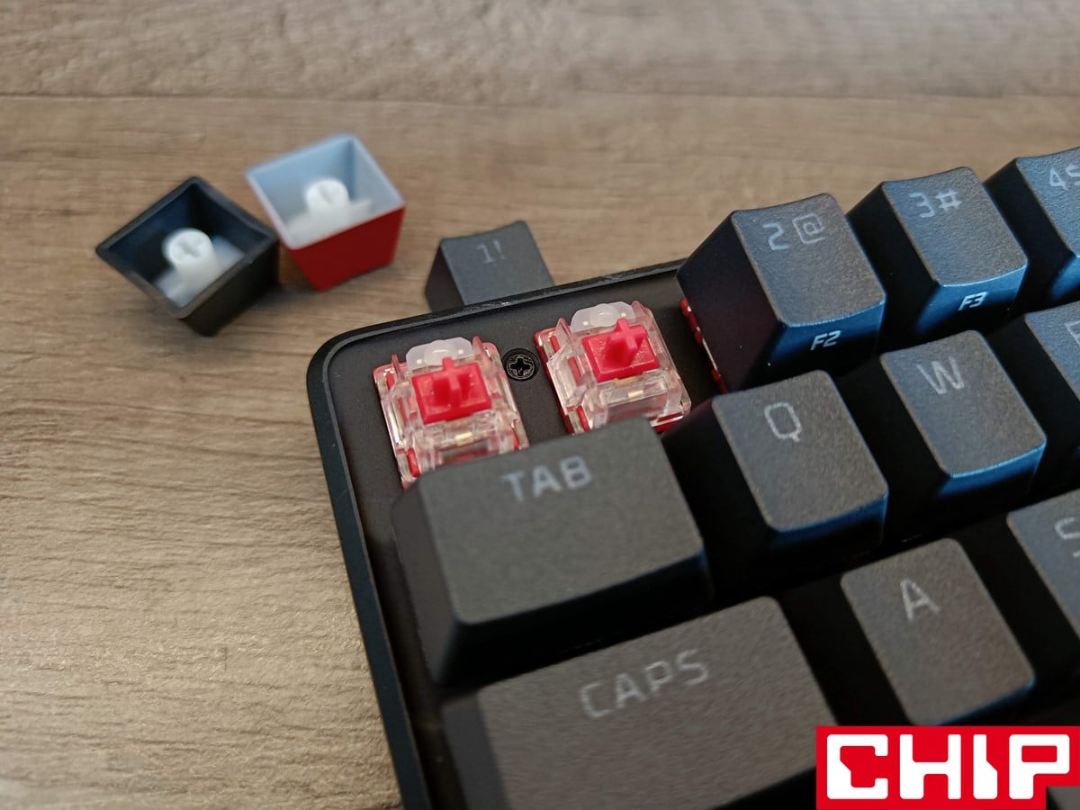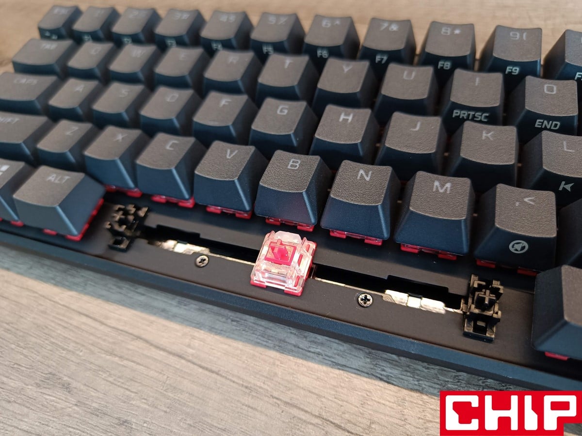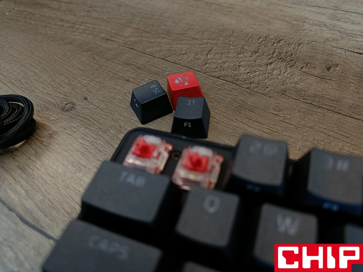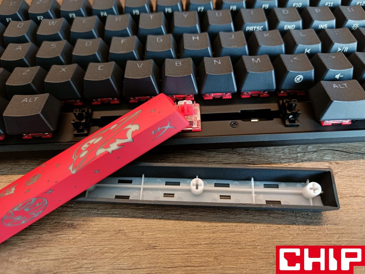 Warto też wspomnieć, że podczas gdy te małe klawisze bazują zwykle na jednym przełączniku. Te dłuższe klawisze pokroju spacji, entera, shifta, czy backspace zostały dodatkowo wsparte przez HyperX za pomocą podobnych do przełączników “wsporniki”. Te są stałe (pełnią funkcję czegoś w rodzaju filarów) i dzięki temu utrzymują stabilność przełącznika bez zauważalnego wpływania na jego działanie.