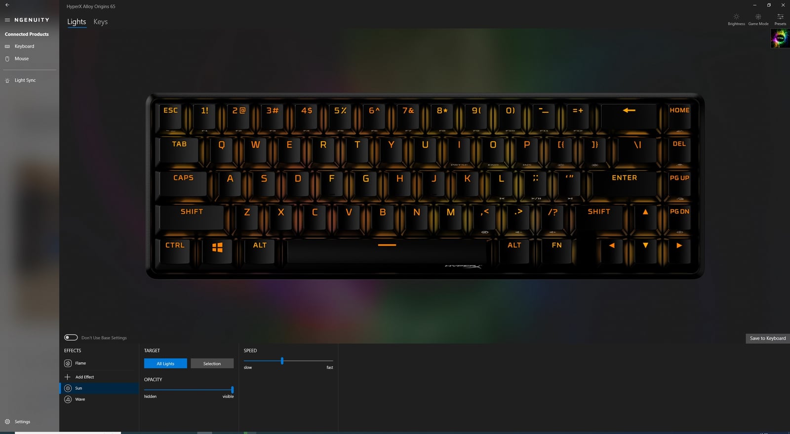 Oczywiście HyperX zadbał o podstawowe ustawienia pokroju jasności czy szybkości oraz kierunku efektu, ale to, co jest w moich oczach najważniejsze, to możliwość ustawienia każdej diody osobno. Chociaż efektów na liście nie ma wielu (ledwie 3), to są one jak najbardziej wystarczające, pozwalając nawet ustawić zarówno efekt stały, jak i momentu aktywacji.