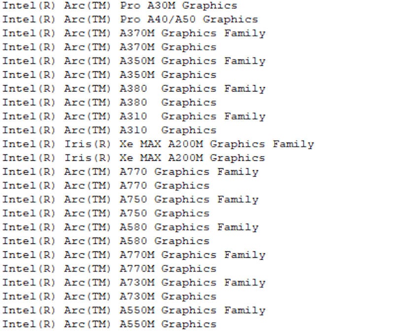 W najnowszej aktualizacji sterownika (30.0.101.1723), który jest zresztą spóźniony o dobre 2 tygodnie, podano kompletną listę kart graficznych Intela. Tyczy się to nawet tych, które finalnie nie weszły na rynek i dlatego właśnie to pierwszy raz, kiedy Intel oficjalnie potwierdził, że szykuje na rynek modele A770, A750, A580, A380 i A310. Na ten moment nie wiadomo, co stanie się z A780 i A350, a nawet nie wiemy tego, czego powinniśmy oczekiwać po tych modelach.