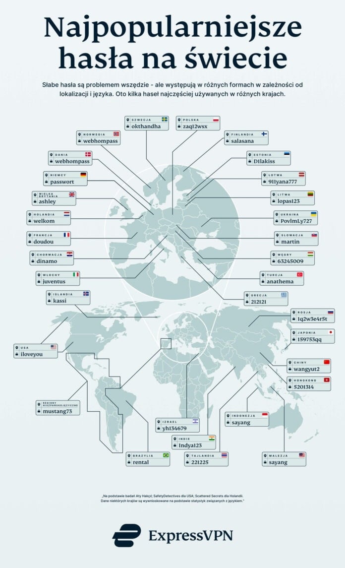 Jeśli idzie o inne kraje, najbardziej przykuwa wzrok juventus we Włoszech, iloveyou w USA (dziwne, że nie we Francji), passwort w Niemczech i webhompass w Danii oraz Szwecji. Dokładne dane oraz sposób przygotowania tego podsumowania znajdziecie na stronie ExpressVPN, a jeśli ktokolwiek z Was ma dokładnie takie hasło w jakimkolwiek serwisie, na którym Wam zależy, to koniecznie sugeruje możliwie najszybszą zmianę. Chyba dobrze być odpornym na najprostsze ataki obejmujące próby włamania się na bazie listy najpopularniejszych haseł, czyż nie?