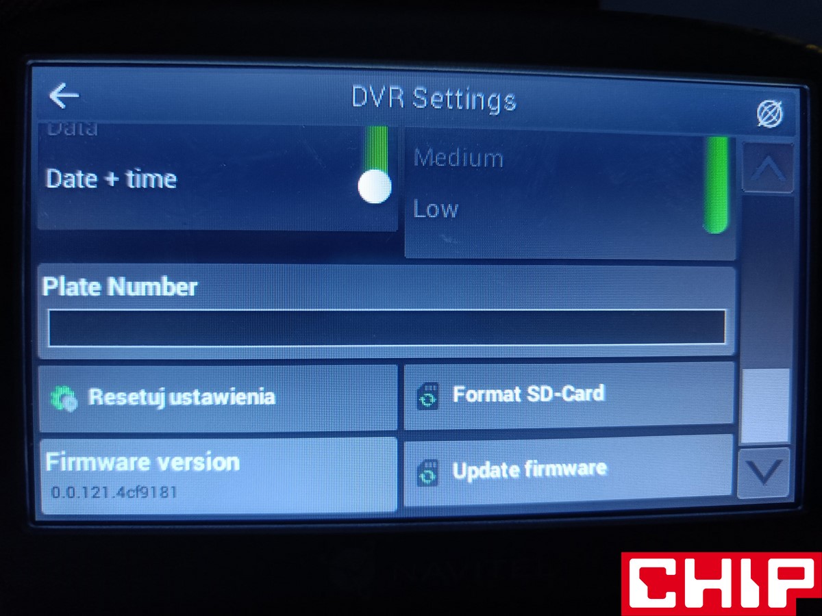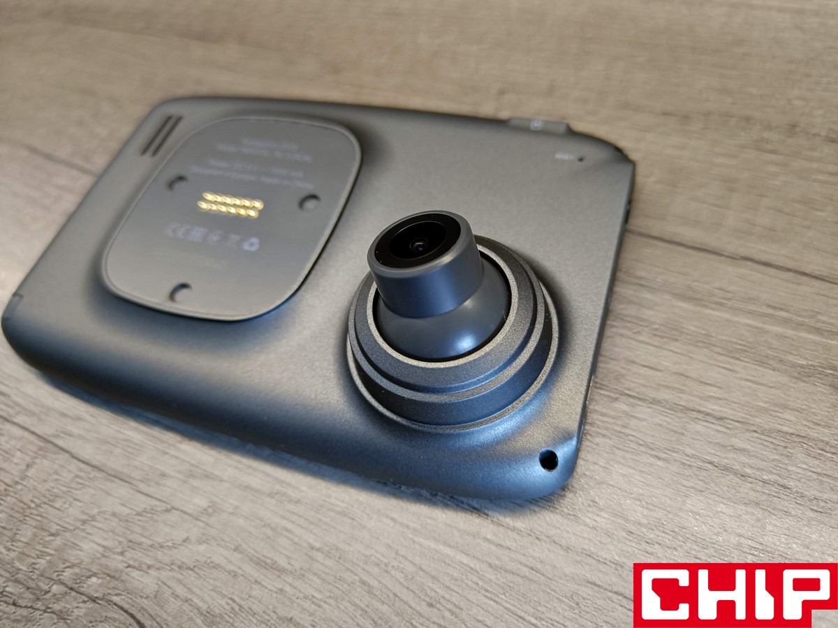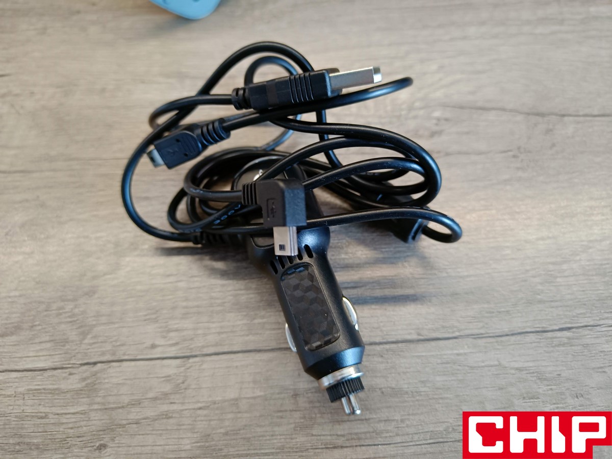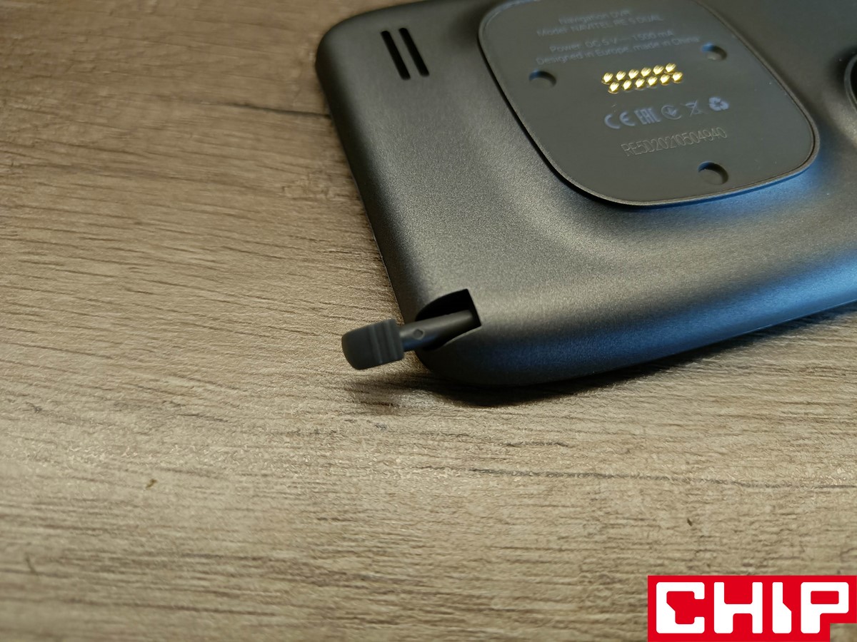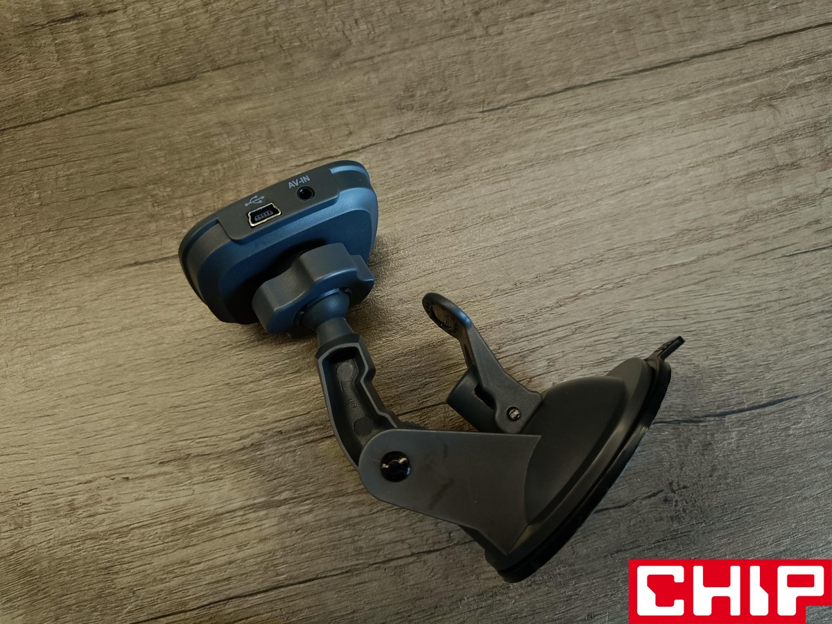 Wyposażenie? Na przyssawce znalazł się port zasilający i złącze do podpięcia opcjonalnej kamerki tylnej, a na wideorejestratorze przycisk on/off, ukryty przycisk resetu, port z myślą o zasilaniu i transferze danych, port jack 3,5 mm, dioda funkcyjna, głośnik oraz mikrofon. Szczególną uwagę zwróćcie na dwa sloty na pamięć microSD, bo jedna jest przeznaczona dodatkowym mapom, a druga samemu wideorejstratorowi i może obsługiwać karty o pojemności do 32 GB.