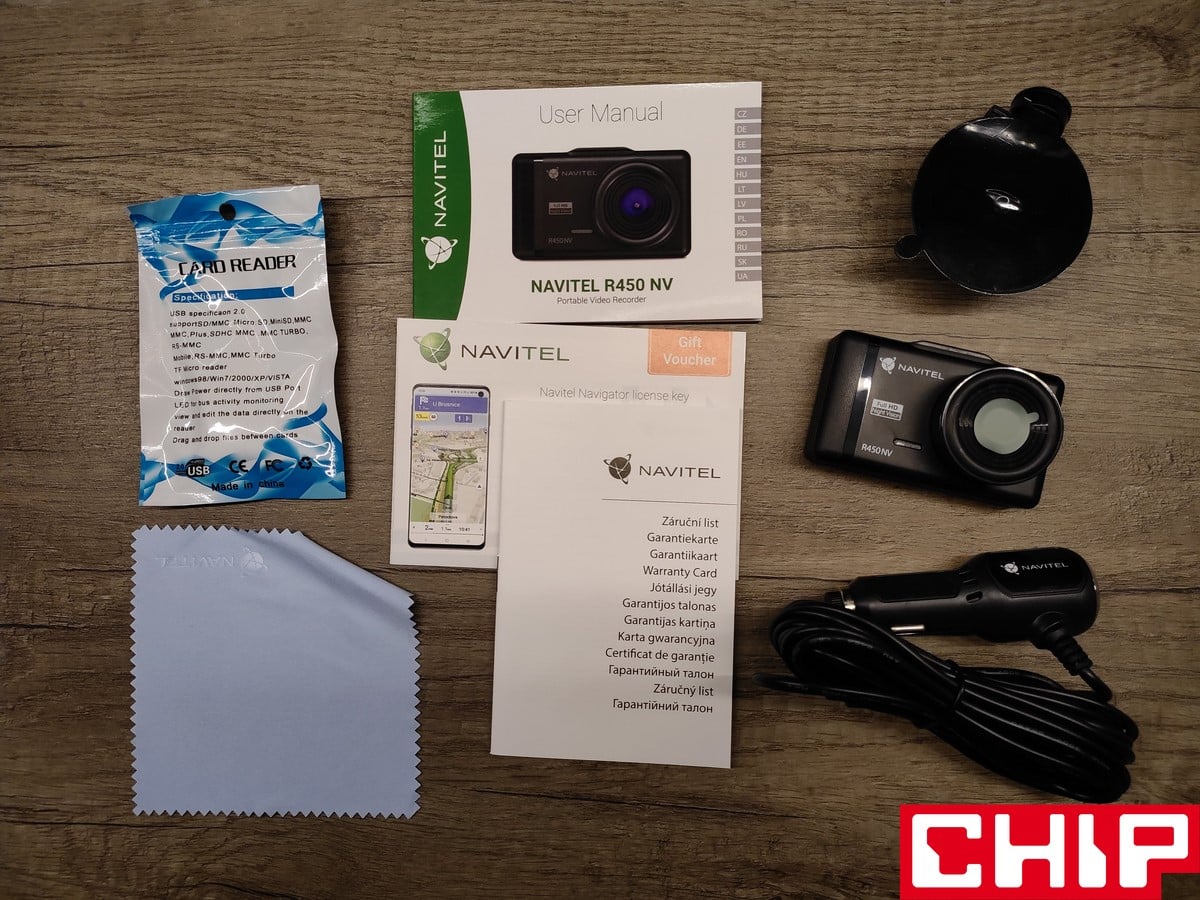 Navitel R450 NV należy do serii wideorejestratorów tego producenta, które zaczęły nas rozpieszczać wyposażeniem. Oprócz elementów kluczowych do działania sprzętu (350-cm przewodu zasilającego, przyssawki do szyby), otrzymujemy też szmatkę do przecierania ekranu i obiektywu, czytnik kart pamięci na USB, instrukcję obsługi oraz prezent w postaci dodatkowej licencji nawigacji producenta na całe 12 miesięcy.