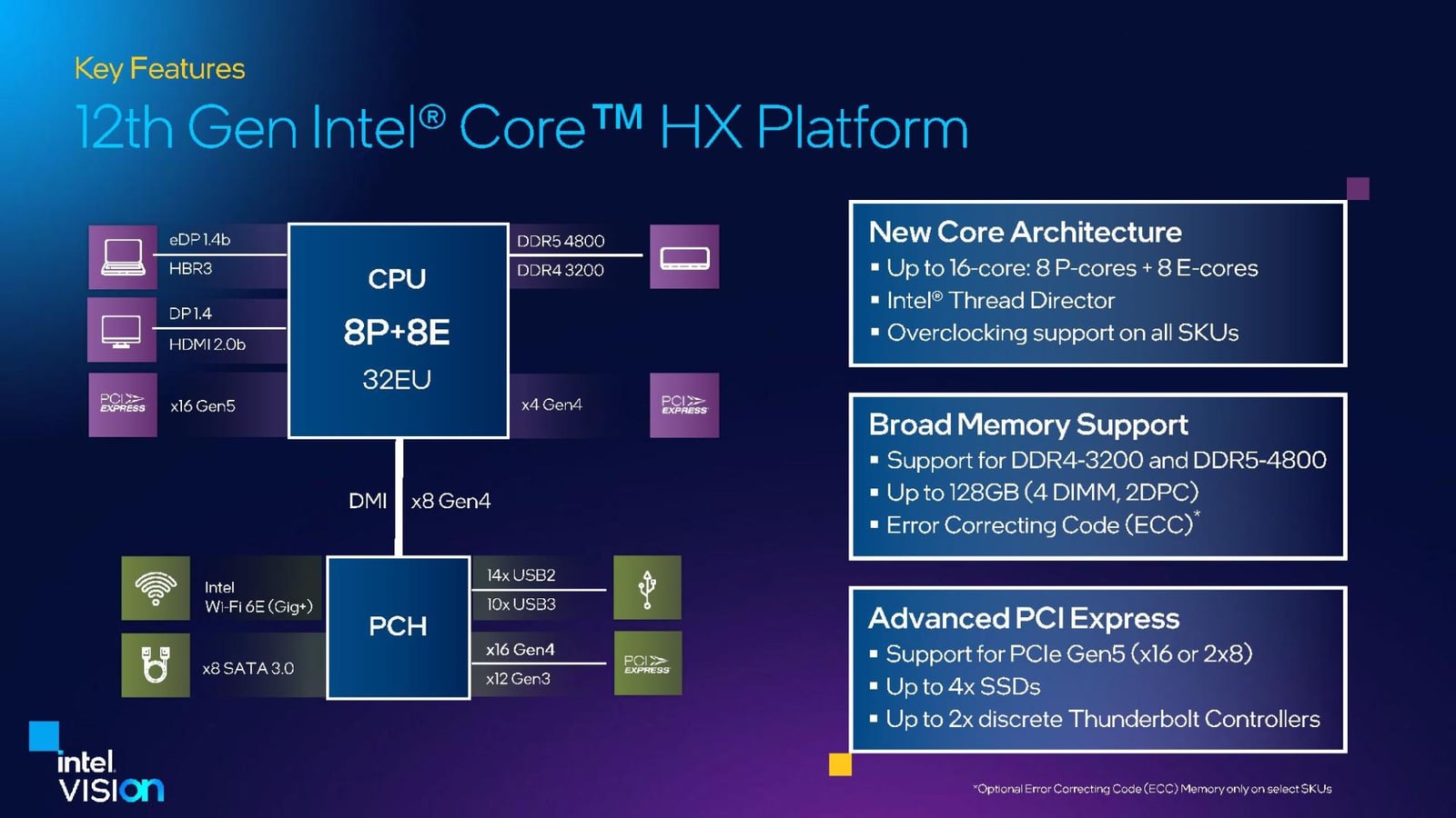 Każdy z procesorów Intel Core HX 12. generacji wspiera do 128 GB pamięci DDR4-3200 lub DDR5-5200 (również warianty LPDDRX) w łącznie czterech modułach, nawet cztery dyski SSD M.2 PCIe 4.0×4 czy interfejs PCIe 5.0 z myślą o kartach graficznych nowej generacji.